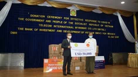 (VOVWORLD) - 7 월 13 일 오전 미얀마 양곤 (Yangon)에 위치한 미얀마 보건체육부 청사에서 리 꾸억 뚜언 (Lý Quốc Tuấn) 베트남 대사는 코로나19 방역을 위한 베트남 정부의 지원금 5 만 달러를 미얀마에 전달했다.