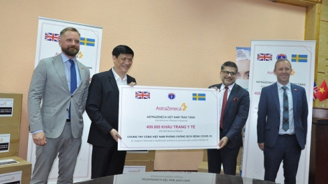 (VOVWORLD) - 5월 19일 오후 하노이에서 영국 AstraZeneca기업은 베트남의 지속적 코로나19 방역을 지원하기 위해 보건부에 400,000 개 마스크를 전달하였다.