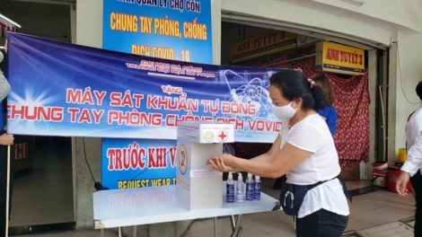 (VOVWORLD) - 3월 30일 다낭시 공상청은 꼰 시장, 한 시장, 동다 시장, 화 끄엉 시장 등 4개 대형 시장 출입구에 자동 손 소독기 4대를 설치했다. 이 손 소독기는 다낭시 사범대학 학생들과 직원들이 연구 및 제작하여 기증한 것이다.