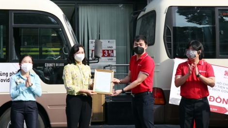 (VOVWORLD) - 8월 17일 오전 호찌민시 코로나19 방역 기금 접수 및 분배 위원회는 BRG그룹과 SeABank가 기부한 100억 동 상당의 29인승 카운티 차량 10대를 수령하고 전달했다.