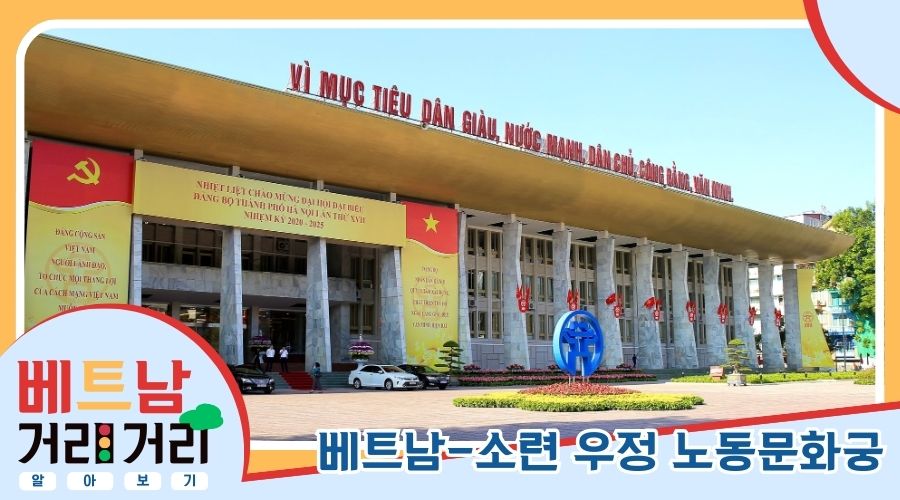 홍응옥: 쩐흥다오 거리를 이야기할 때, 91번지에 위치한 베트남-소련 우정 노동문화궁을 결코 빼놓을 수 없겠죠. 이곳은 과거 1902년 하노이 전시회를 기해 완공되었던 ‘그랑 팔레(Grand Palais d'Exposition)’, 즉 더우싸오(Đấu xảo) 구역이 있던 자리입니다. 여기서 ‘더우 싸오’란 것이 수공예품의 정교함과 산업 성과를 겨루던 일종의 박람회장을 뜻하는 베트남어 표현인데요. 당시 이 건물은 17헥타르에 달하는 넓은 부지에 강철과 유리로 지어진 건축학적 걸작이었습니다. 20세기 초 하노이의 번영을 상징하는 아이콘이었죠. 안타깝게도 제2차 세계대전 당시 연합군의 공습으로 이 장엄한 건물은 산산조각이 나 완전히 파괴되고 말았습니다. 이후 1954년에 ‘뭉못탕남(Mùng một tháng năm, 5월 1일 즉 노동절) 광장’이 들어섰고, 1985년 그 옛 터 위에 현재의 노동문화궁이 건립되면서 도시 최대의 문화 생활 중심지라는 명성을 오롯이 이어가고 있습니다.