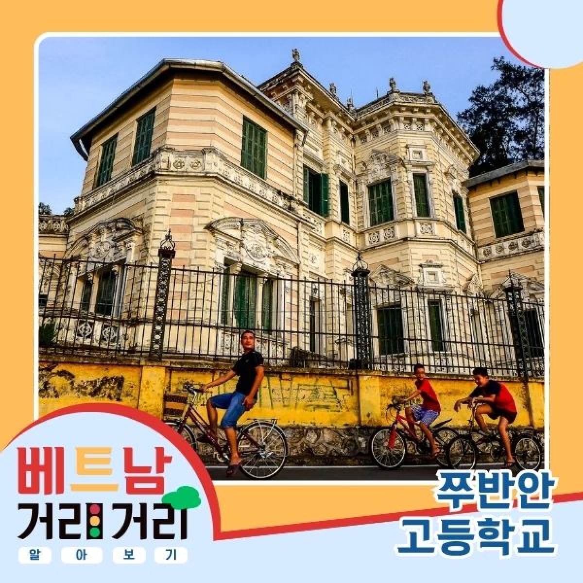 뚱응옥: 네, 그리고 앞서 잠깐 소개해 드린 것처럼, 이 거리에는 쭈반안(Chu Văn An) 영재 고등학교가 자리하고 있습니다. 이곳은 단순한 교육 기관을 넘어, 2004년에 국가 역사 문화 유적으로 지정될 만큼 수도 하노이의 깊은 학구열을 상징하는 곳이기도 하죠. 원래 이 학교는 1908년 12월 18일, 프랑스인들에 의해 ‘보호령 중학교’라는 이름으로 처음 세워졌습니다. 하지만 하노이 사람들은 민족의식과 ‘께브어이’라는 이 지역에 대한 자부심을 담아, 언제나 ‘브어이(Bưởi) 학교’라는 정겹게 불려왔습니다. 학교 교정은 예전 프랑스 건축 양식이 거의 원형 그대로 보존되어 있어서, 따뜻한 노란색 벽과 붉은 기와지붕, 그리고 널찍하게 탁 트인 복도가 아주 고풍스럽답니다. 오늘날까지도 쭈반안 고등학교는 베트남을 대표하는 명문고 가운데 하나로 높은 위상을 유지하고 있습니다.