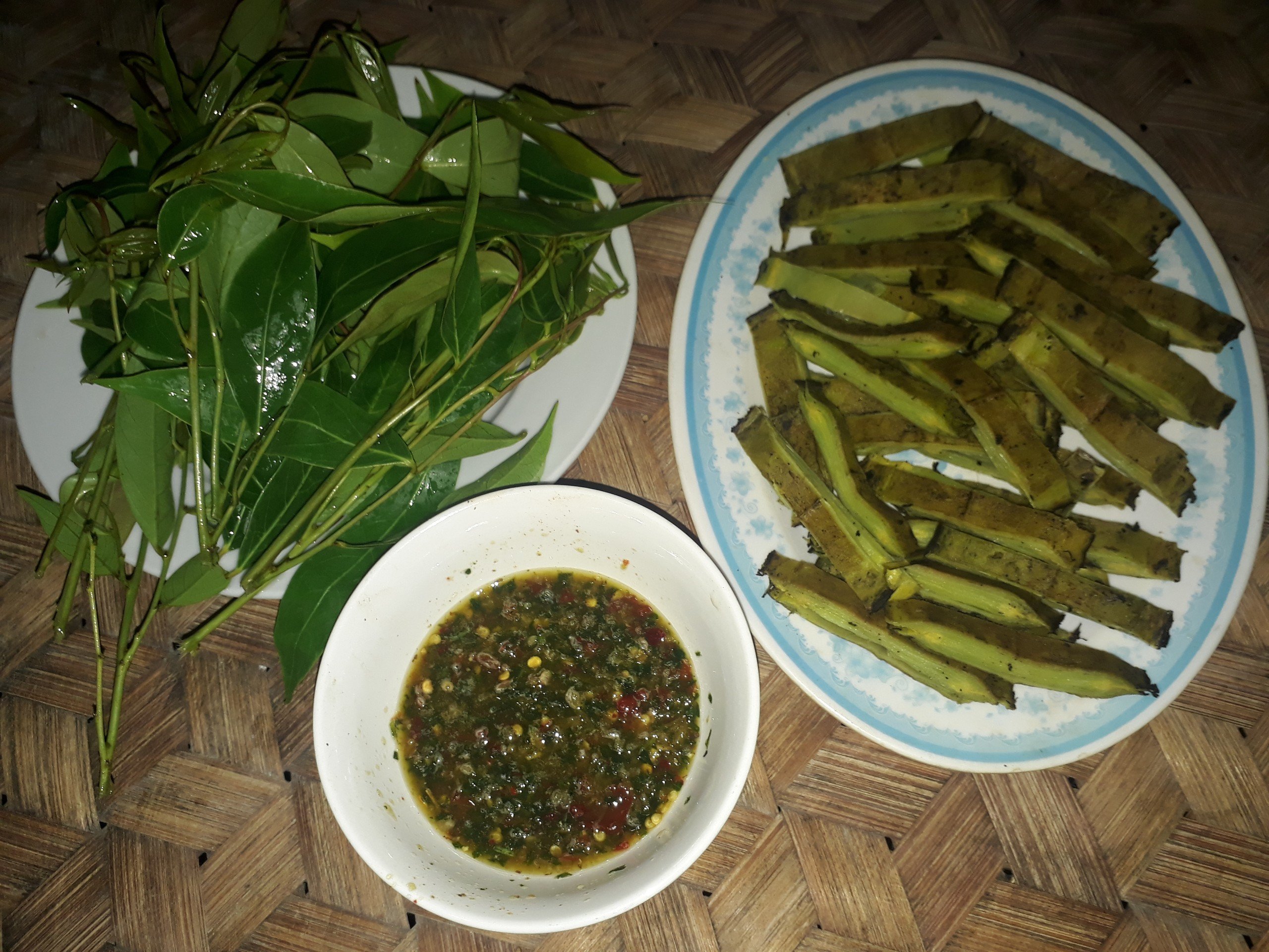 눅낙을 손가락 크기로 잘라 다양한 잎으로 싸 ‘짬째오(chẳm chéo)’라는 고유의 소스에 찍어 먹는다. [사진: VOV] |
