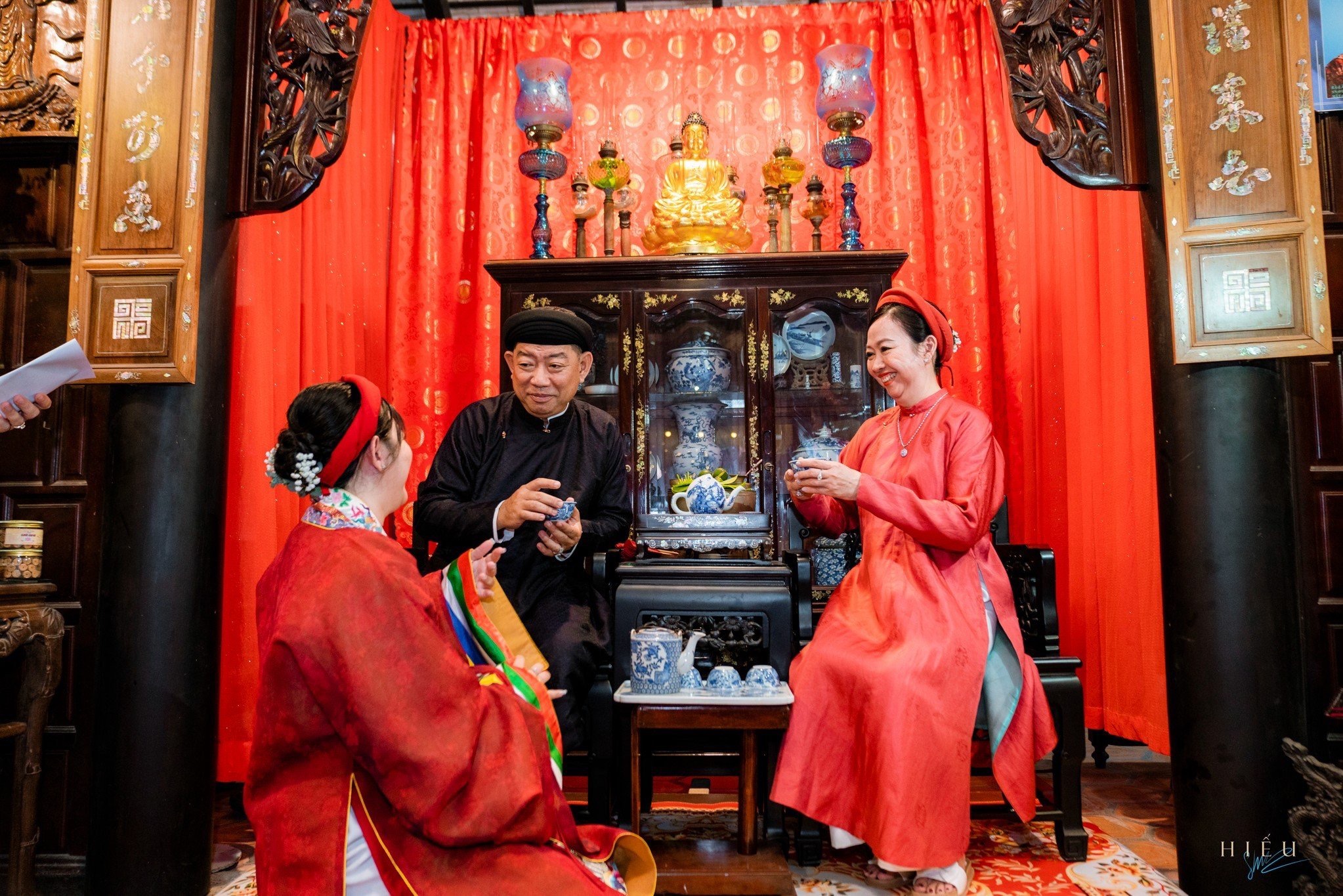 관객들에게 신부의 조부모와 부모를 소개한 후 럼 뜨엉 번 신부가 나와서 부모와 함께 조상에게 분향한다. 다음에 부모의 은혜에 감사하기 위해 신부가 무릎을 꿇고 차를 따라 부모에게 올린다. 이어서 신부가 조부모와 친척에게 차를 올리고 사랑하고 감사하는 마음을 표한다. 럼 민 찌 씨에 따르면 지방마다 문화가 다르기 때문에 남서부 지방의 고유한 문화대로 이 의식을 재현하기 위해서 그의 가족은 오랫동안 공부해야 했다.