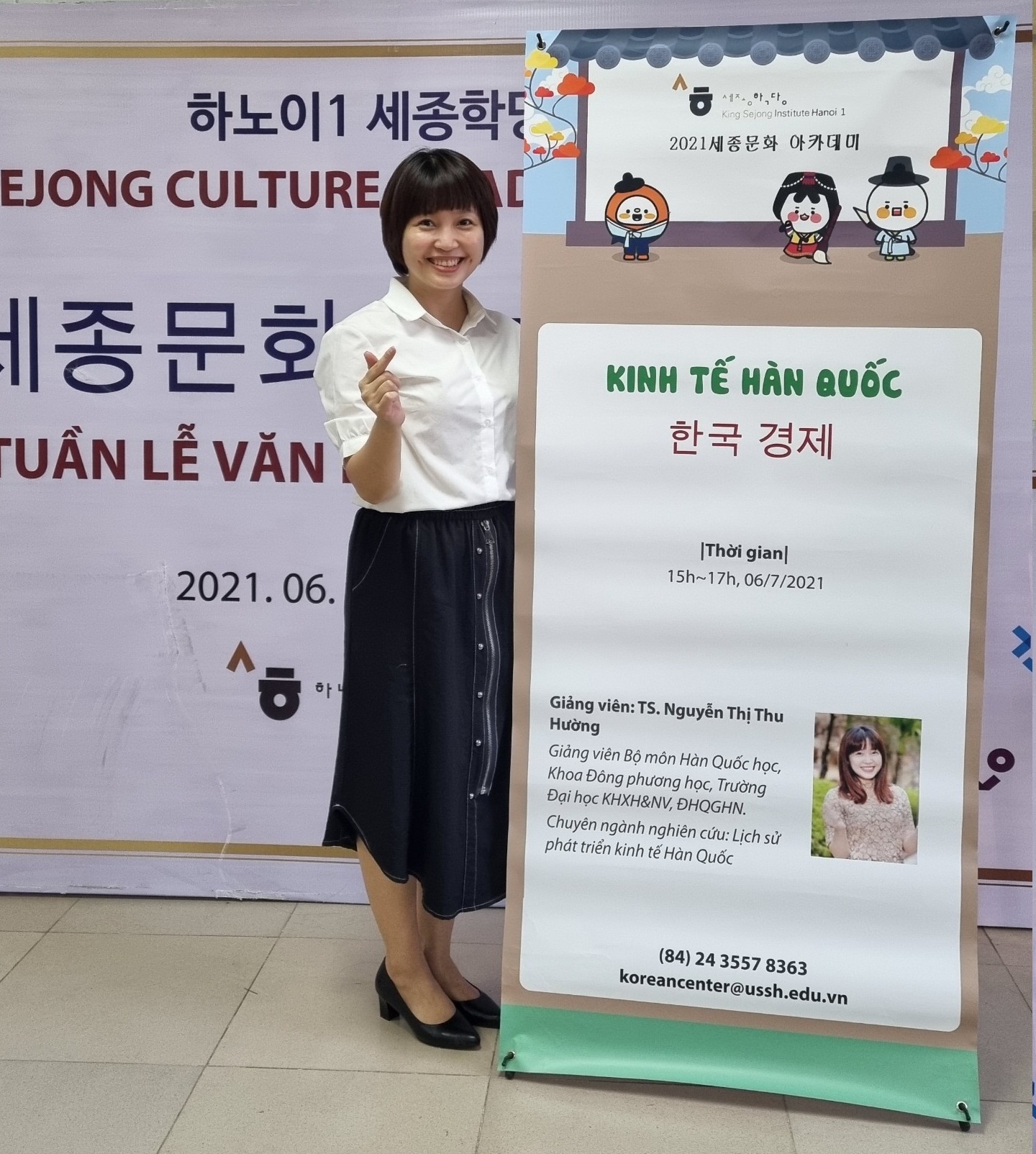 마지막으로 Nguyen Thu Huong 강사의 한국경제 수업이었다. Huong 강사는 한국경제의 발전사를 간단히 소개하고 향후 한국경제의 발전방향에 대해 언급했다. 하노이1 세종학당 학생자들과 함께 인문사회과학대학 한국학과 학생들은 온라인 수업에 적극적으로 참여했다.