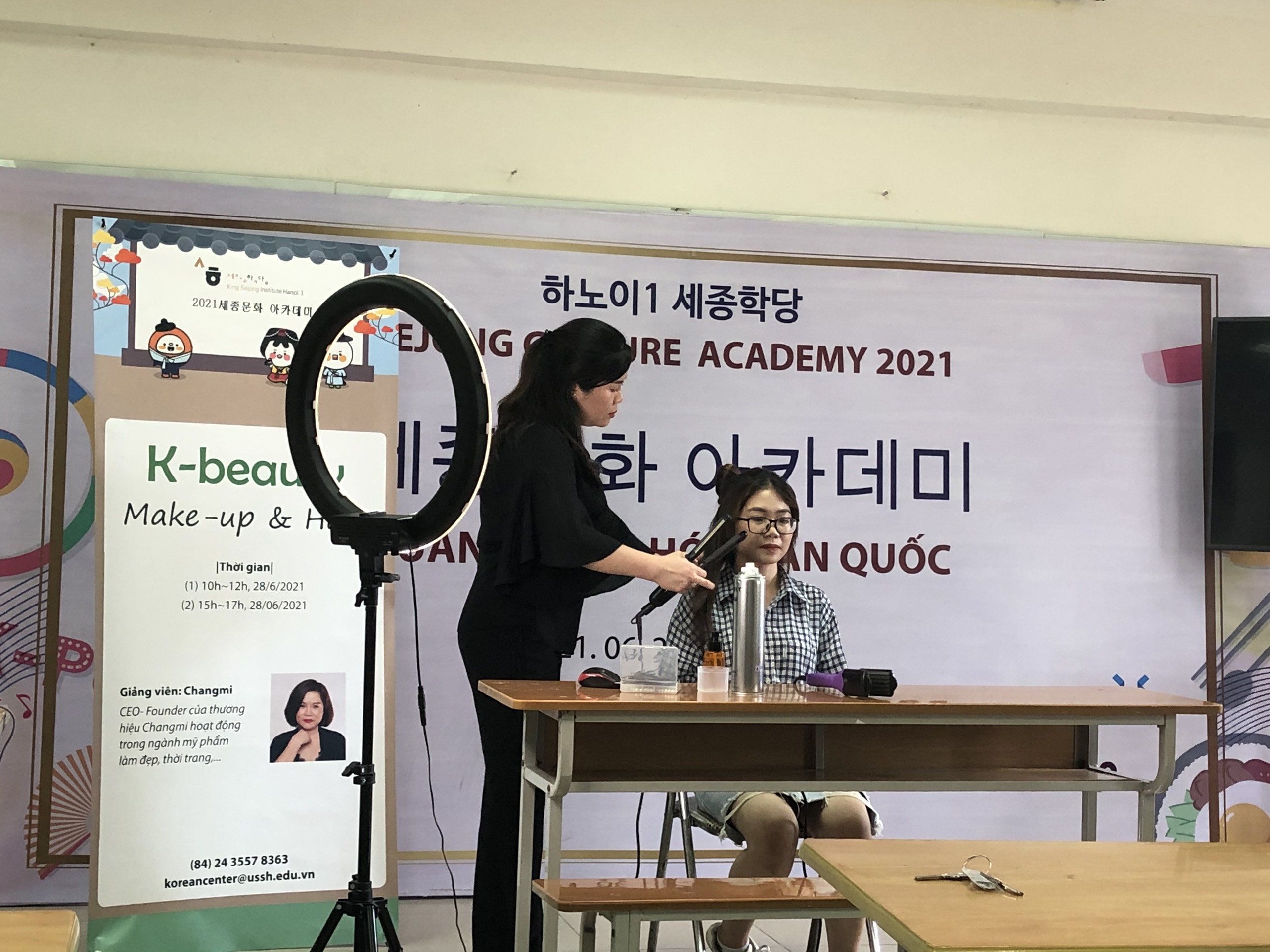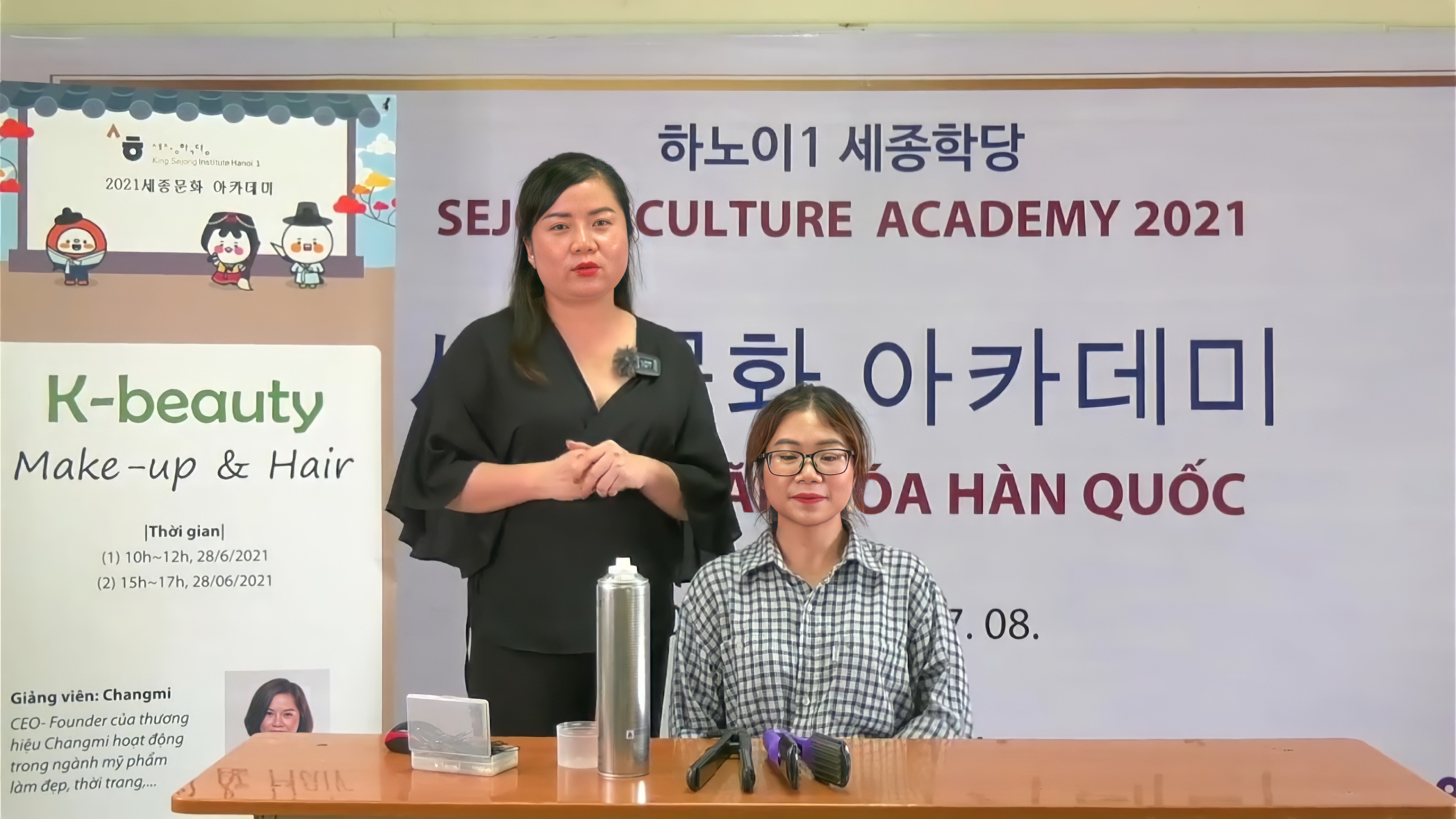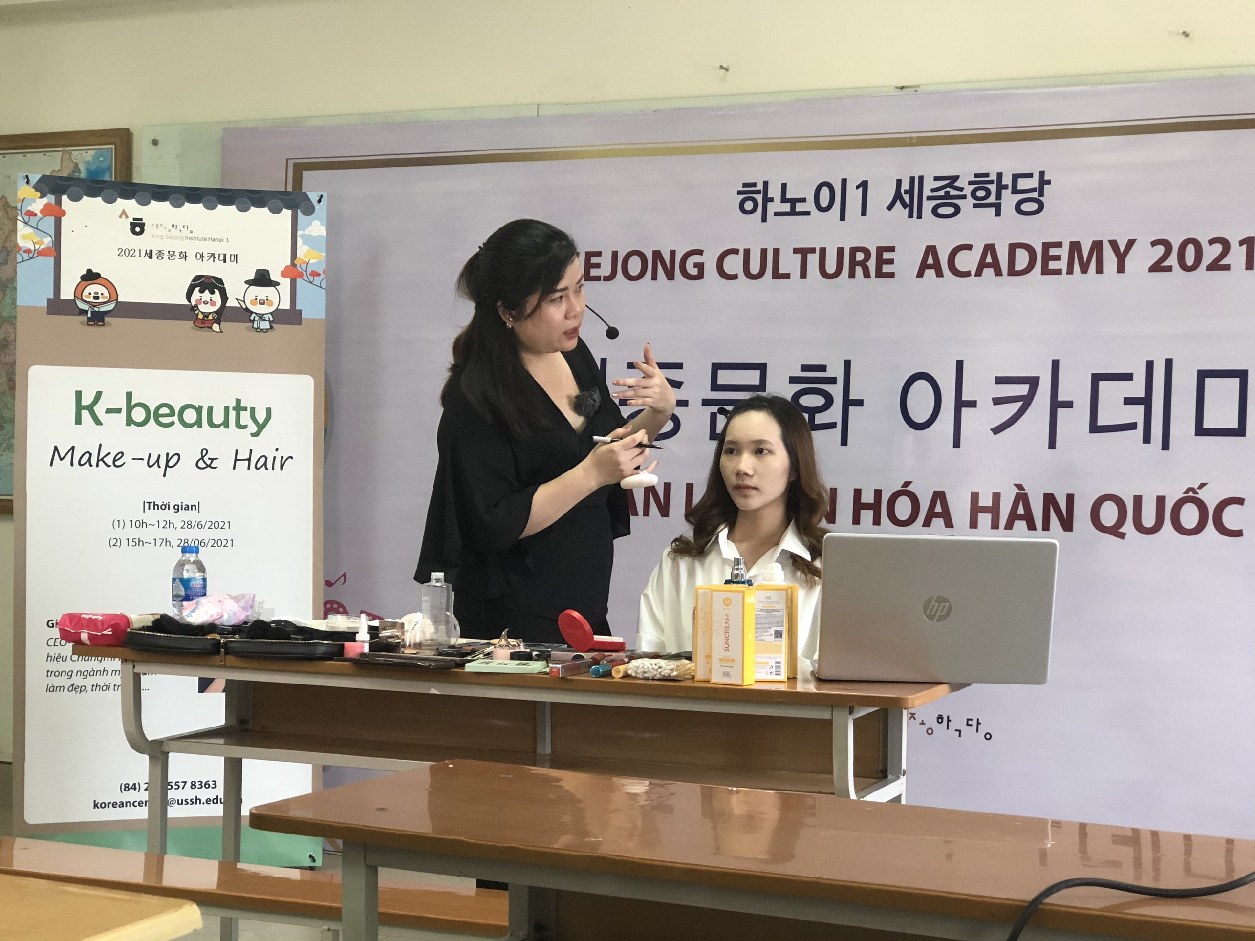 6월 28일 하노이1 세종학당에서 케이뷰티 강좌가 열렸다. Changmi Studio소속 메이크업 전문가인 Dinh Thi Thu Trang 씨는 한국케이뷰티 강좌를 진행했다. 이 강좌는 한국어 학습자들로부터 많은 관심을 끌었다.