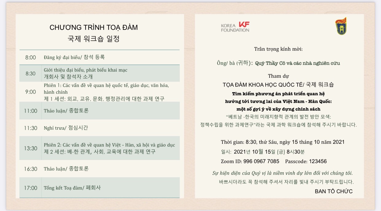 베트남과 한국에서 온 강사, 연구자, 교수, 박사 등이 함께 발표하는 워크숍의 논문은 베트남어와 한국어로 기재됐다. 워크숍에서 발표하는 논문은 베트남 한국학술연구회의 '한국' 저널에 등재될 예정이다.