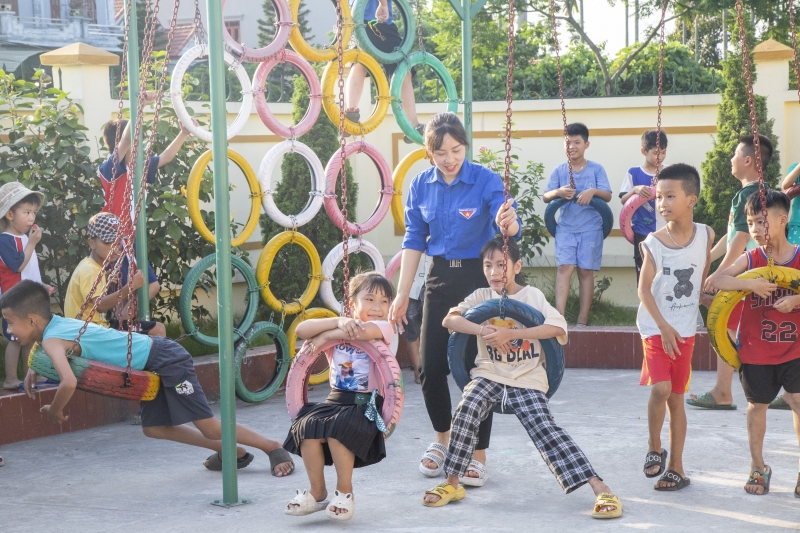 올해 여름 꽝닌성 꽝옌(Quảng Yên)면 하안(Hà An)동 8호 주거 마을 공동 놀이터에는 언제나 아이들의 웃음으로 가득하다. 이 놀이터는 여름 시기 어린이들에게 기쁨을 만들어 주겠다는 마음으로 하안동 청년단이 지역 유관 기관과 협력해 제작한 것이다. 어린이들이 안전하게 놀 수 있도록 이곳 청년단과 청년들이 놀이터에 와서 아이들을 관리하고 아이들의 연령과 기호에 맞춰 각종 놀이를 안내한다. 그네, 시소 등과 같은 놀이기구들이 재활용‧친환경 자재들로 만들어졌으며 다채로운 색깔과 동물 모형들이 있다. 놀이터에서 즐거운 시간을 보낸 팜 반 흥(Phạm Văn Hưng) 군과 응우옌 꾸인 뉴(Nguyễn Quỳnh Như) 양은 다음과 같이 말했다.