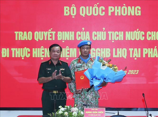 황 쑤언 찌엔 상장은 당 꾸옥 뚜언 중좌에게 7월 27일에 국가주석이 승인한 유엔 평화유지군 파견 결의를 전달했다. [사진: 쫑득/ 베트남통신사] |