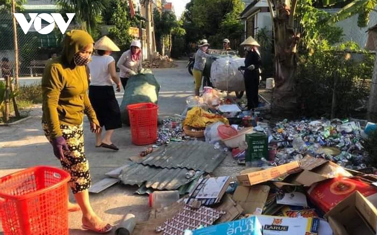 다낭시 썬차 (Sơn Trà)군 토꽝 (Thọ Quang)동 탄빈(Thành Vinh) 4 여성회 지부 회원들은 플라스틱 쓰레기와 파지를 함께 수거하고 있는 모습 [사진: VOV] |
