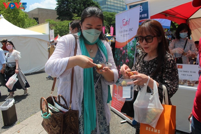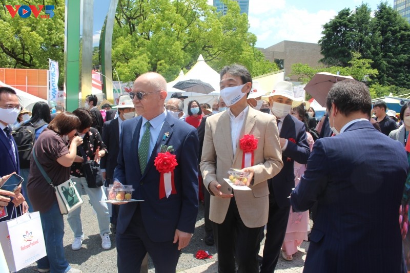 일본 관계자와 주일본 여러 국가 대산관의 대표자들은 베트남 리치를 먹어보고 있다. [사진: 부이훙/ VOV5] |