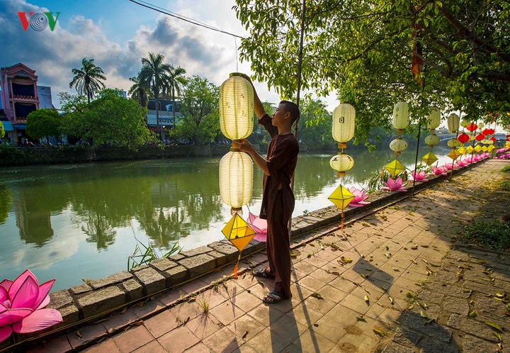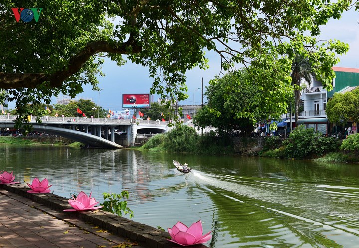 | 흐엉 강과 레러이 거리 (Lê Lợi Street)에는 연꽃 상징물과 연등들의 분홍색이 넘쳐난다. |