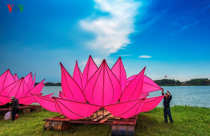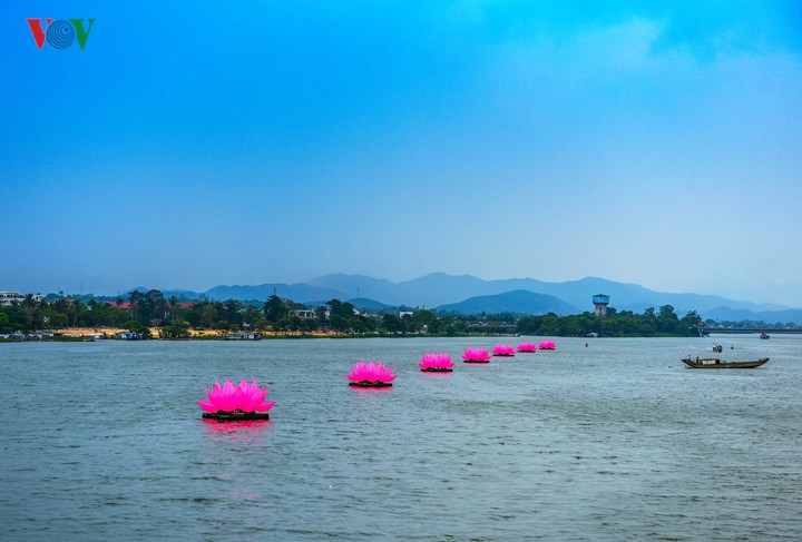 | “청정한 부처 발 뒷꿈치를 받치는 7 송이 연꽃”란 주제의7 개의 연꽃 연등은 부처님의 탄생을 보여주는 발걸음을 비유하는 것이다. 연꽃 연등은 높이 3.2m, 지름 약 8m, 분홍색 실크로 만들어지고 약 150m 간격으로 배치되며 받침대로 7 개의 큰 부표에 올려 놓고 흐엉강에 띄워 놓는다. |