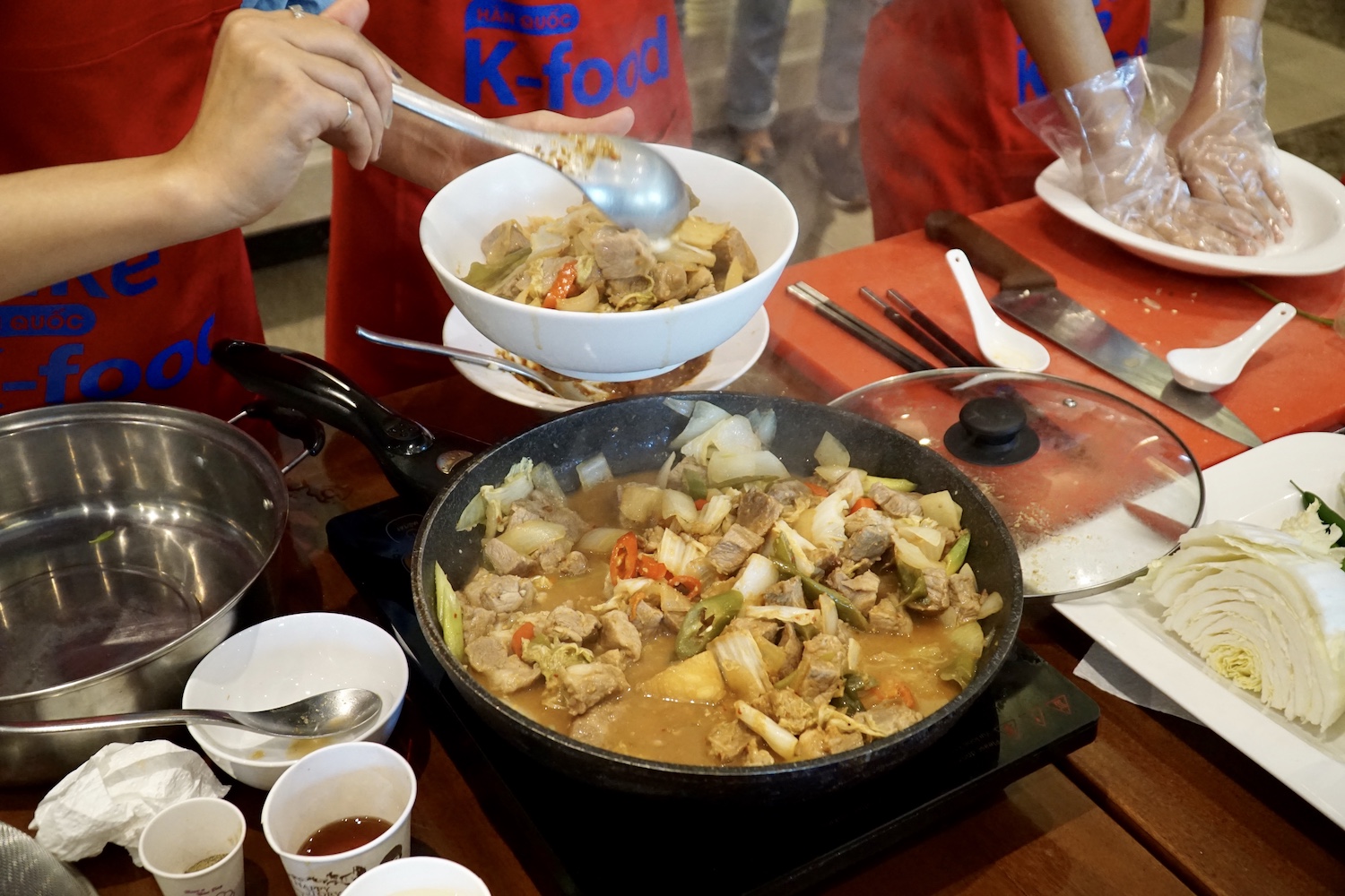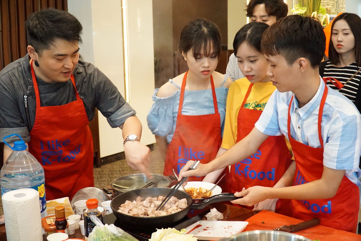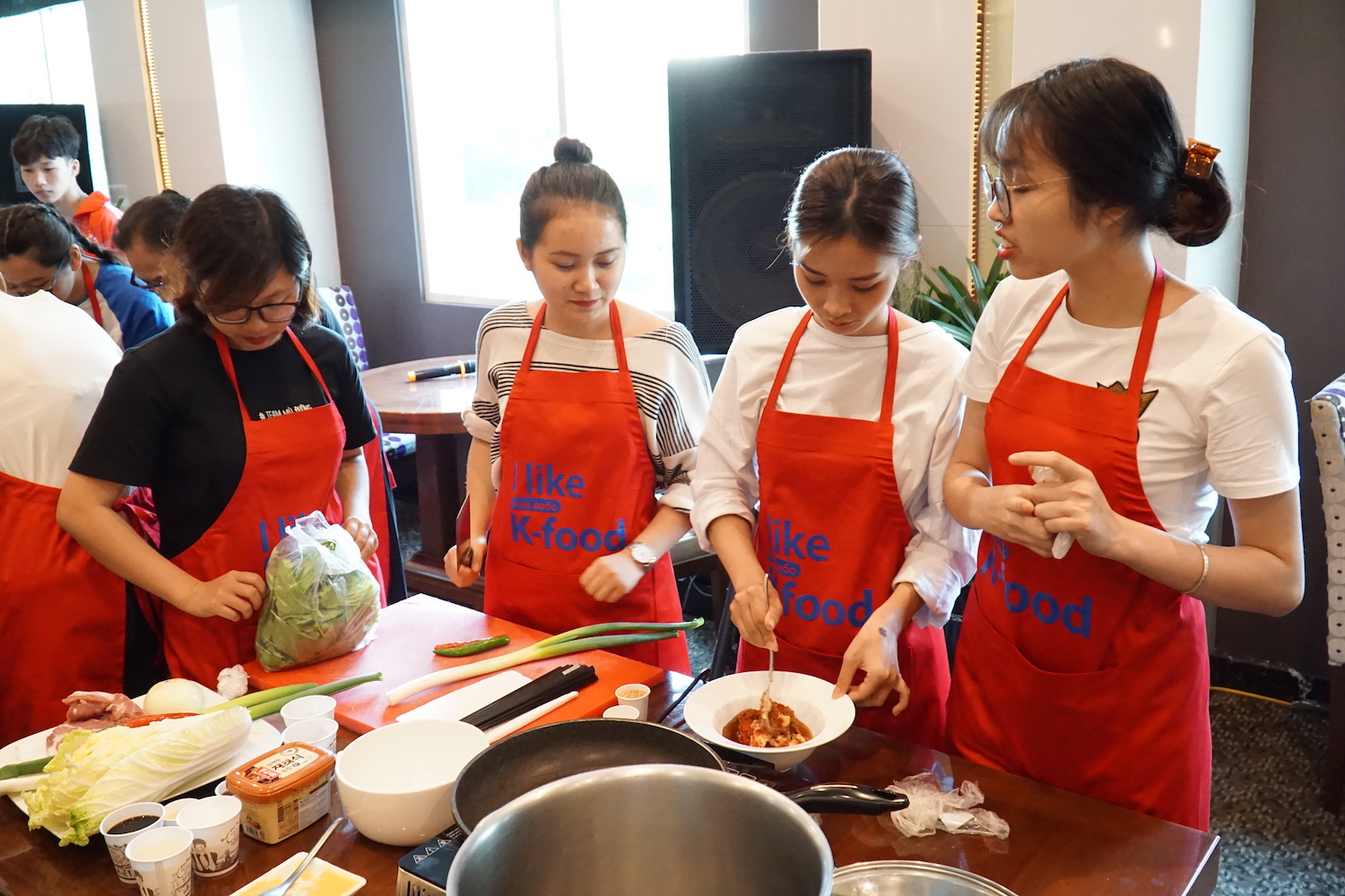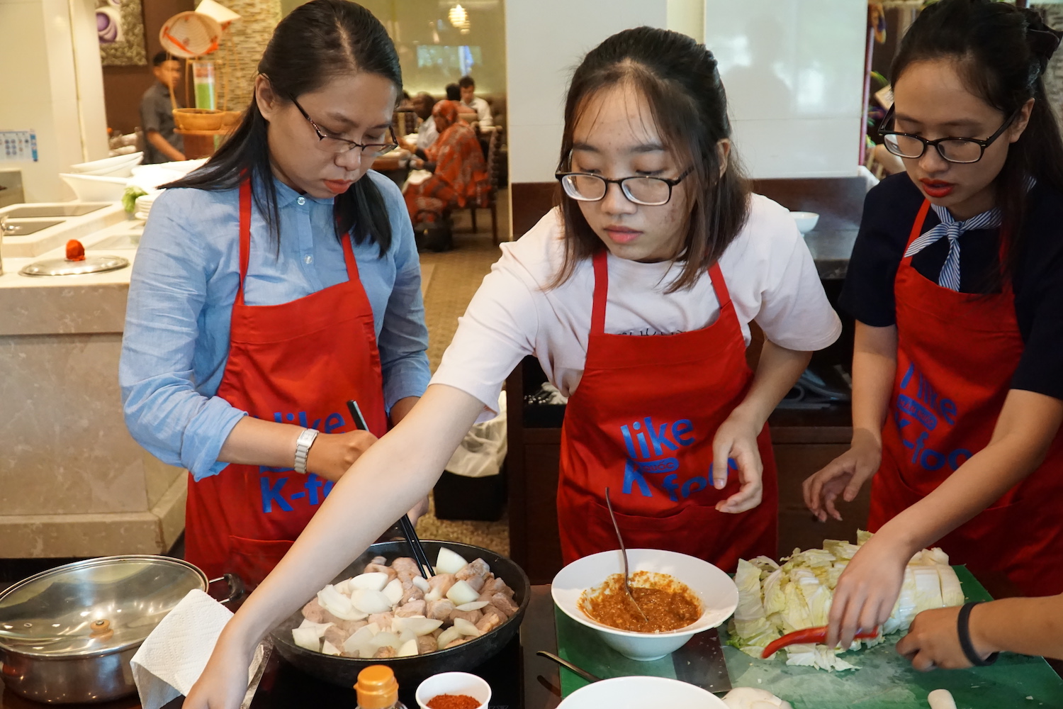 참가자들이 한국 요리법을 집중하게 보고 있습니다.