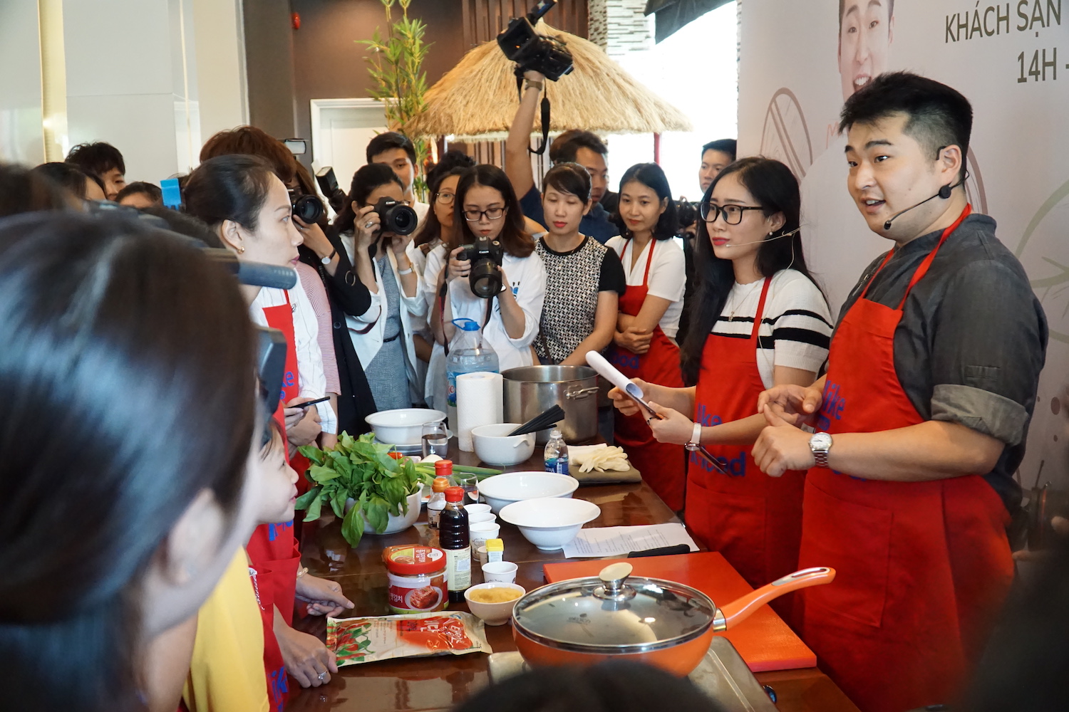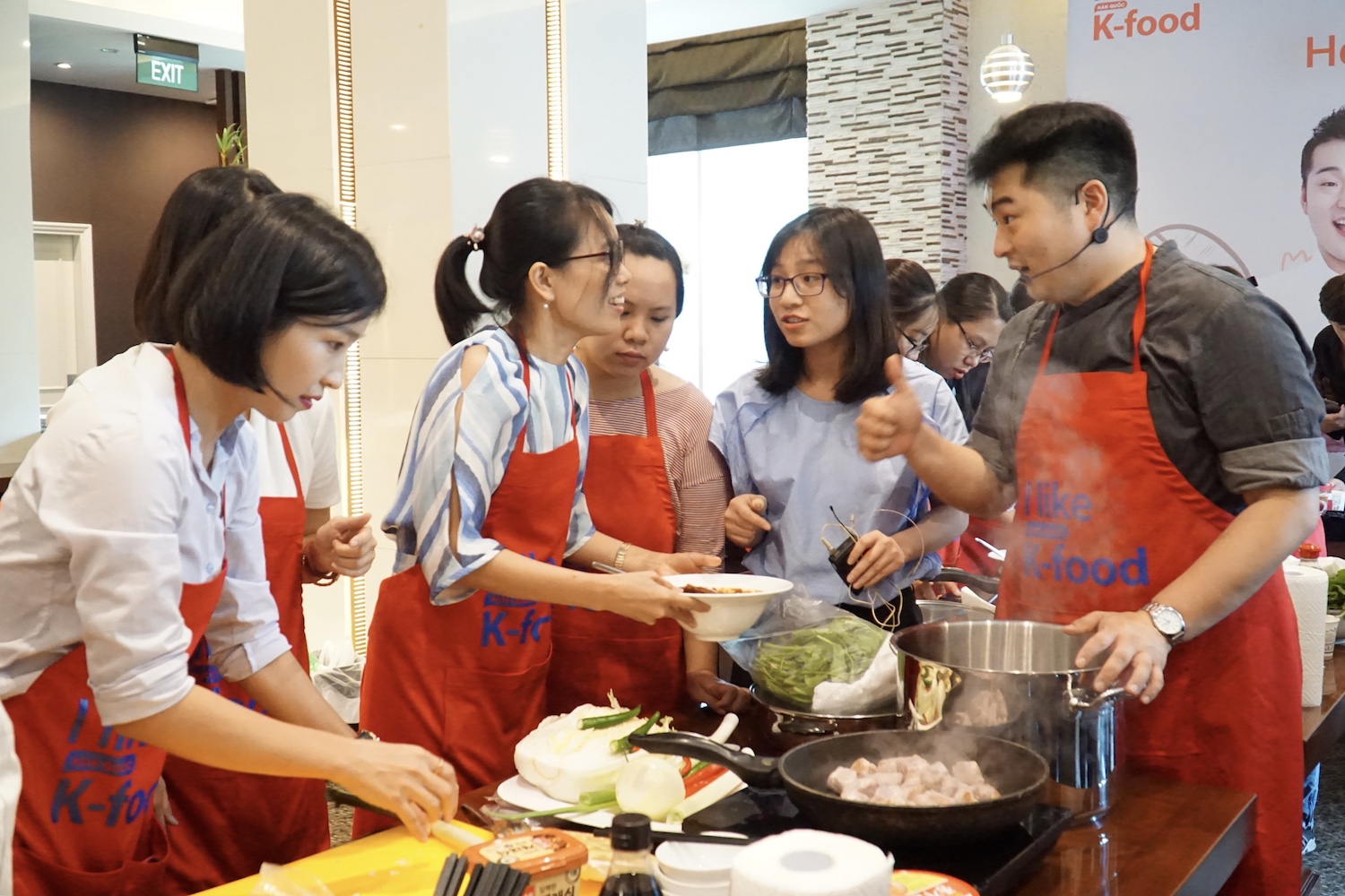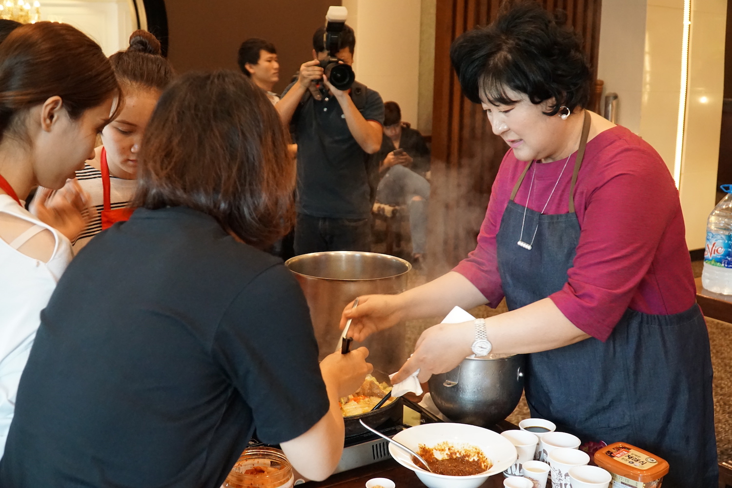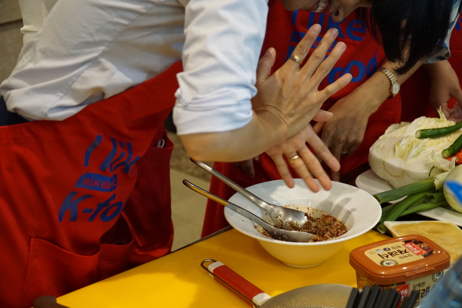 참가자들이 한국 요리법을 집중하게 보고 있습니다.