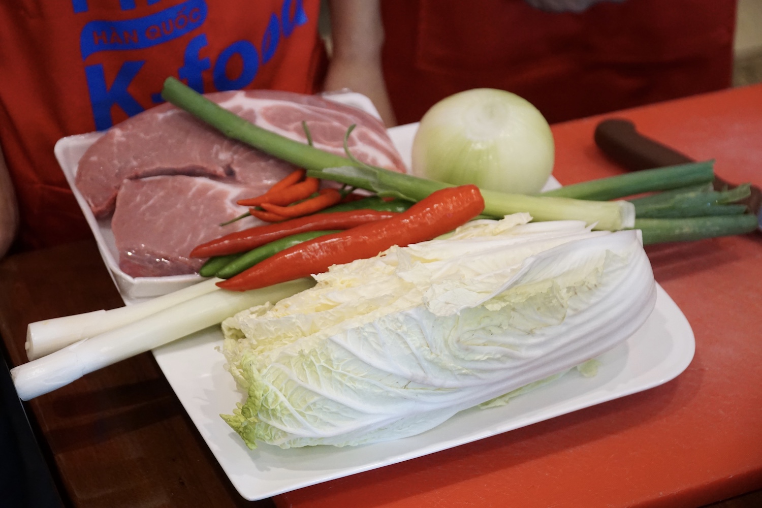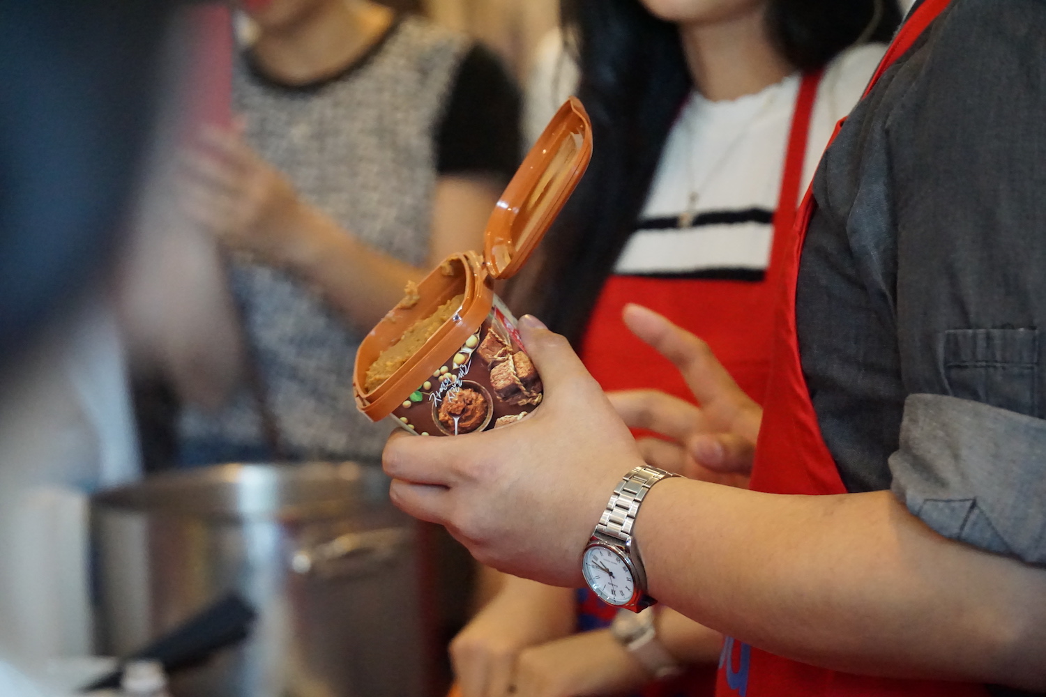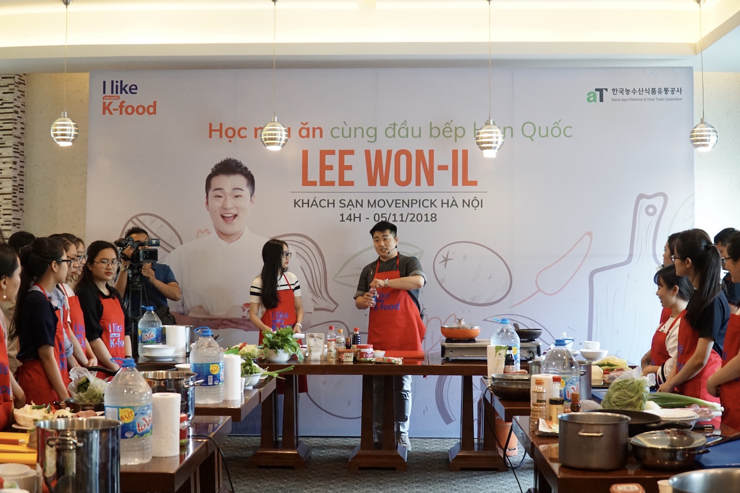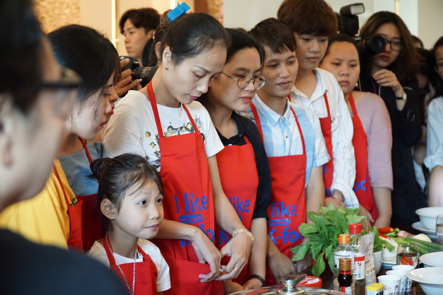 참가자들이 한국 요리법을 집중하게 보고 있습니다.