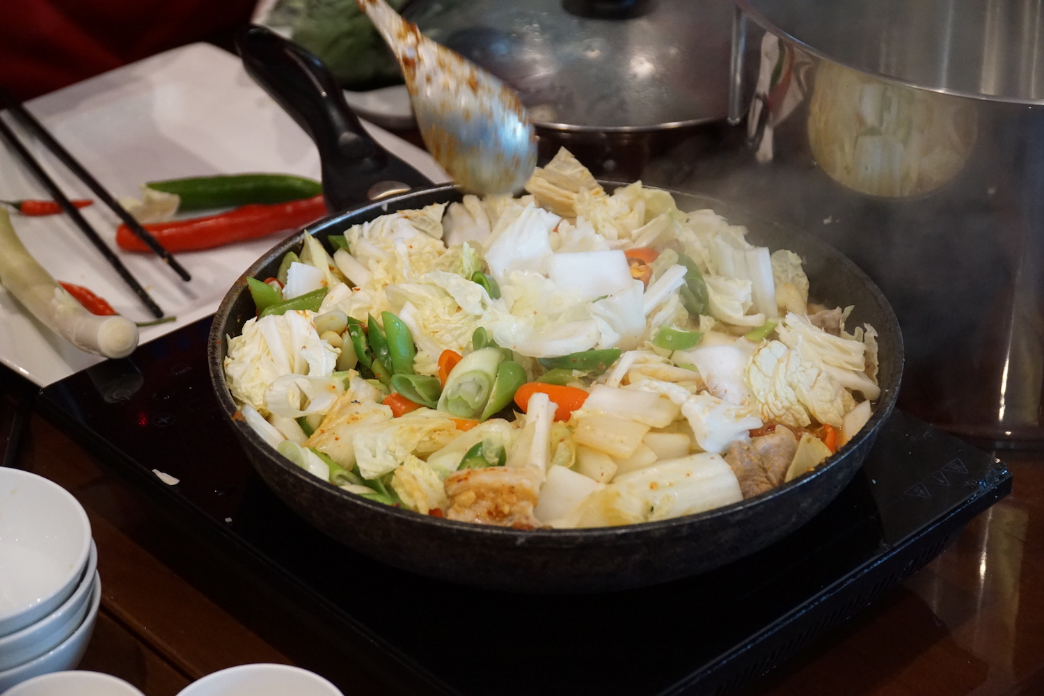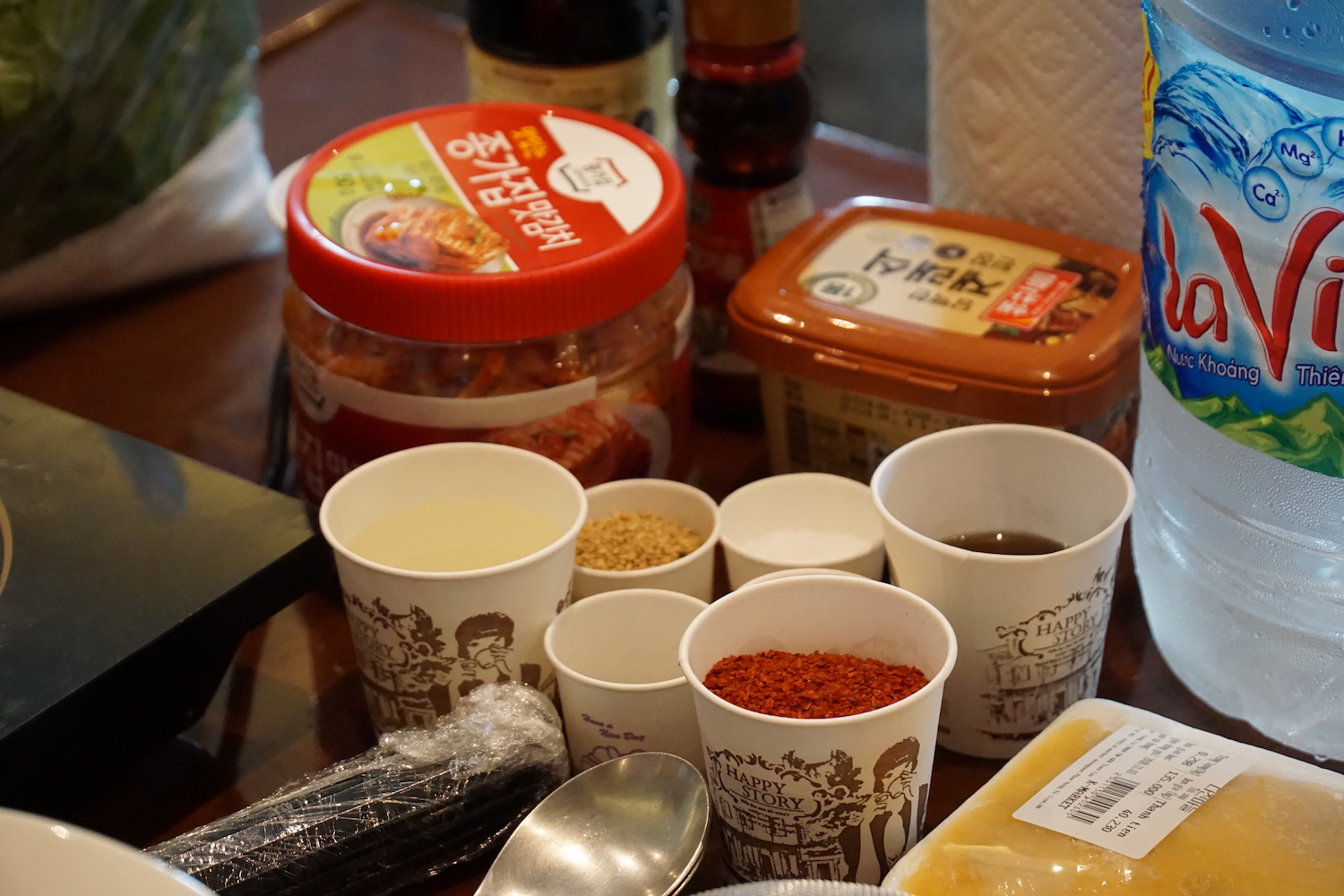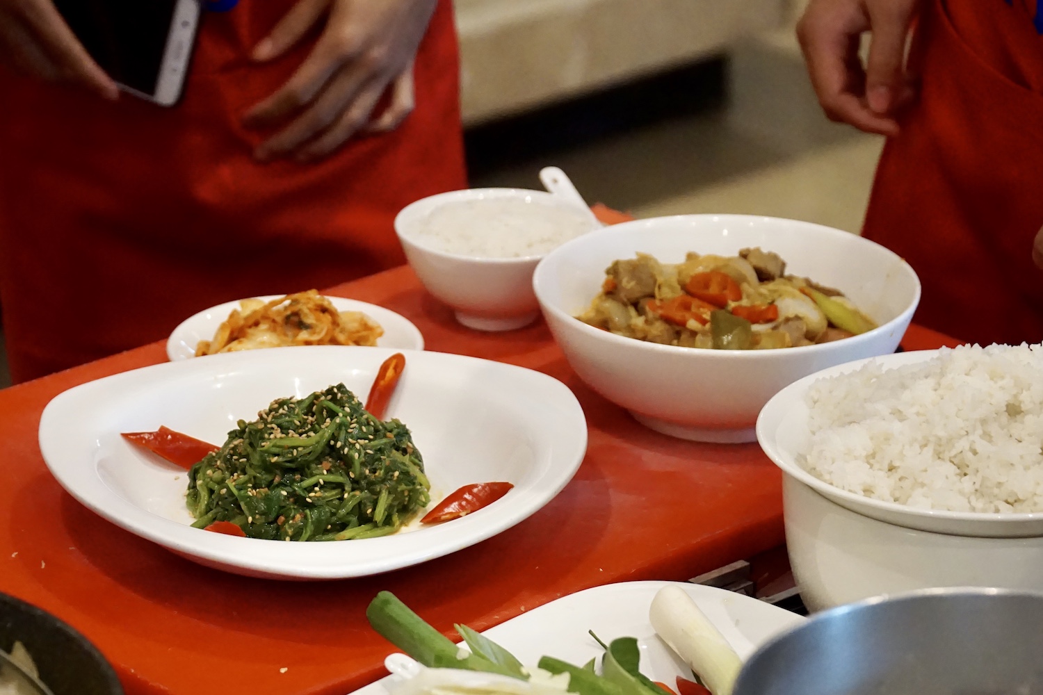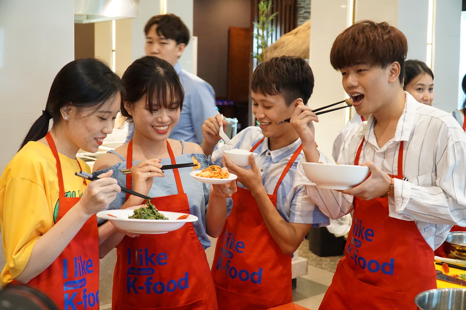 참가자들은 자체 만든 한국 음식을 즐겁게 먹습니다.