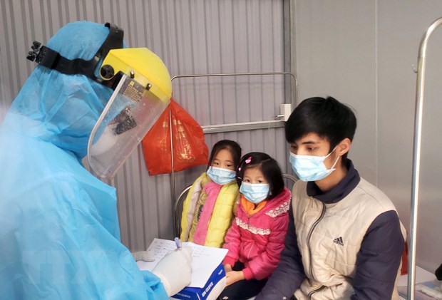 꽝하 (Quang Hà)군 클리닉 격리구역에서 환자의 건강상태를 검사하고 있는 의사 |