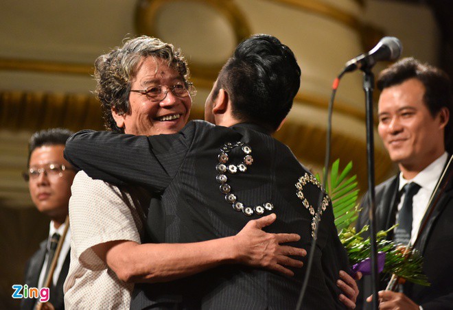 2016년 “영원” 콘서트에서 가수 뚱 즈엉 (Tùng Dương)이 “산정 호수”를 부르고 나서 음악가 포 득 프엉을 포옹하는 모습. [사진: Việt Hùng/zing.vn] |