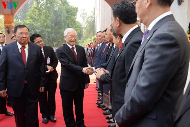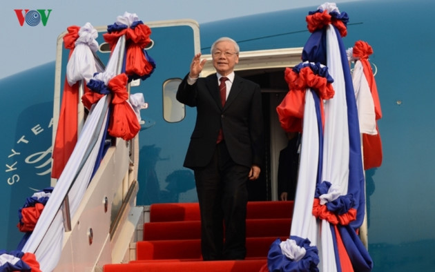 | 2월24일 오전 응우옌 푸 쫑 총서기장-국가주석과 베트남 고위급 대표단은 분낭 보라치트 (Bounnhang Vorachith) 라오스 총서기장-국가주석의 초청으로 수도 비엔타인의 왓따이 국제 공항에 도착하여 라오스 인민민주주의공화국에서 공식적인 우호 방문을 시작하였다. |