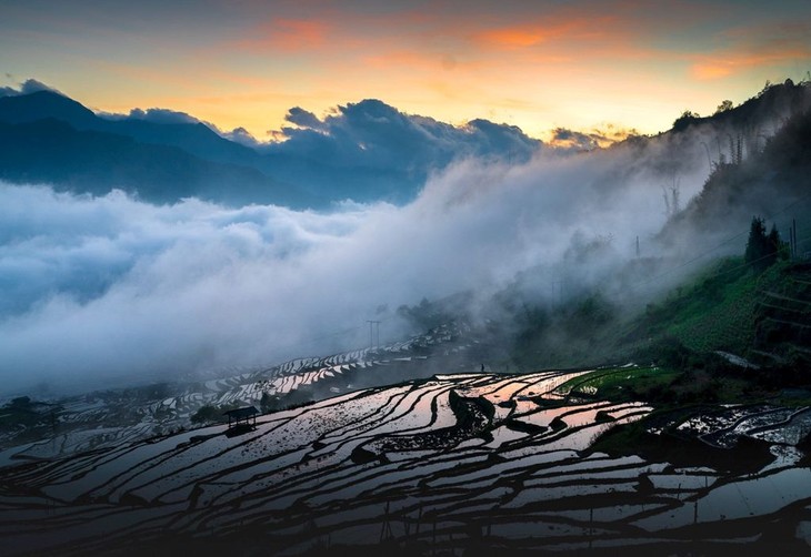 | 비가 쏟아지기 시작하는 시기인 5~6월에 산악지역 주민들은 밭으로 나가 새로운 농무를 위해 준비한다. 수확기 이후 메마른 계단식 논밭에 물을 대면서 또 하나의 아름다운 풍경을 만들어 낸다. (옌바이성 무깡짜이(Mù Cang Chải)현 물대는 시기 계단식 논밭, 사진: 옌바이TV) |