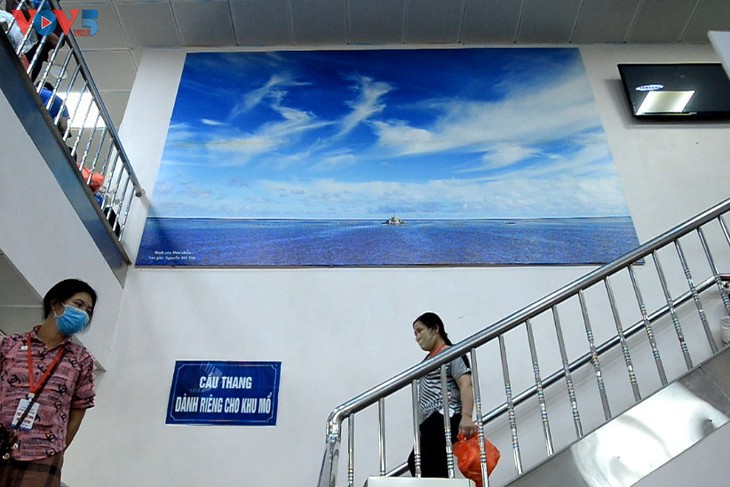 | 지난 1년 이상 동안 응우옌 미 짜 (Nguyễn Mỹ Trà)VOV 기자가 촬영한 쯔엉사 군도의 사진이 병원 로비, 복도, 계단 등에 커다랗게 걸렸다. |