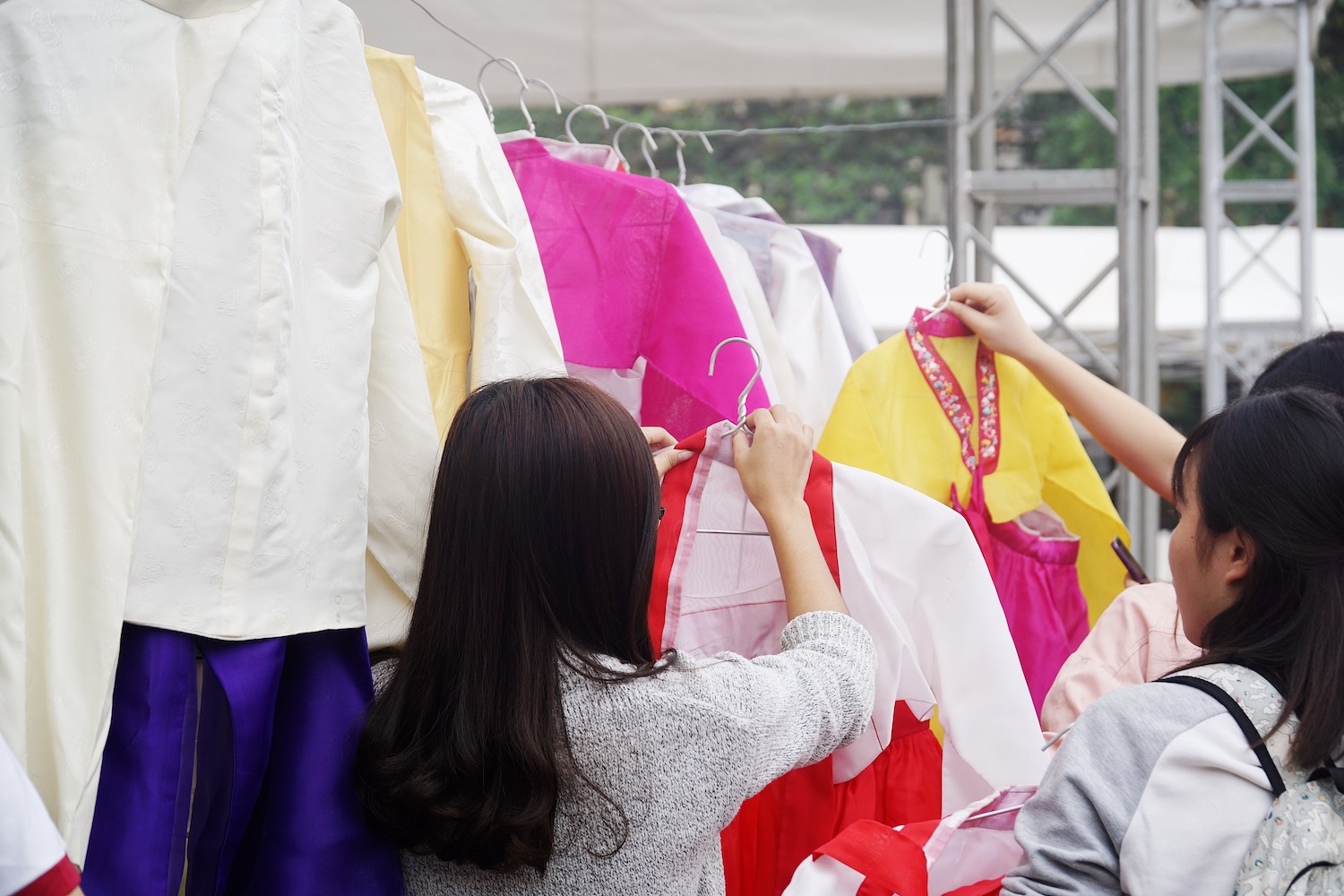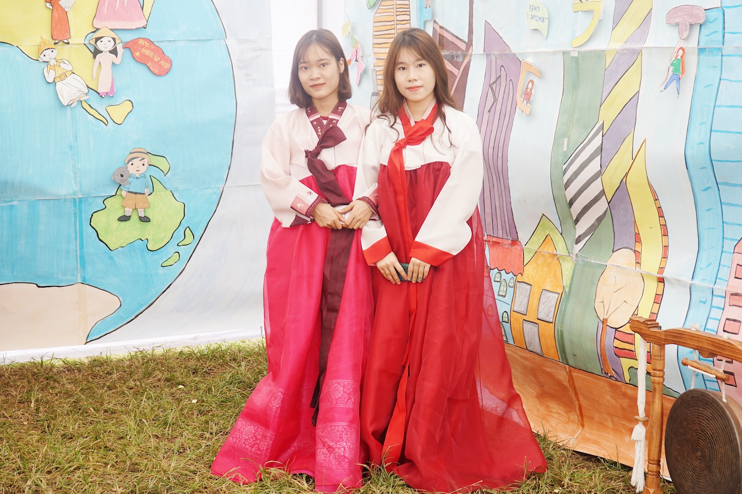 여학생들은 한국의 전통 의상인 한복을 입어 봅니다.