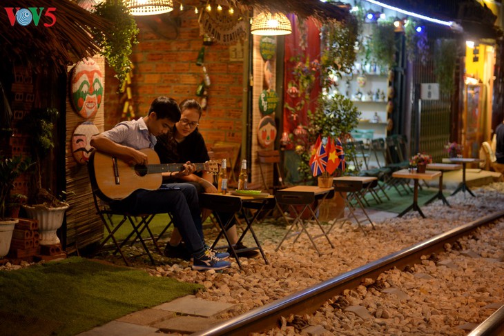 쩐푸거리-풍흥거리 교차점에 있는 철도길에서 사람들은 줄을 지어 이어지는 카페들을 볼 수 있다.