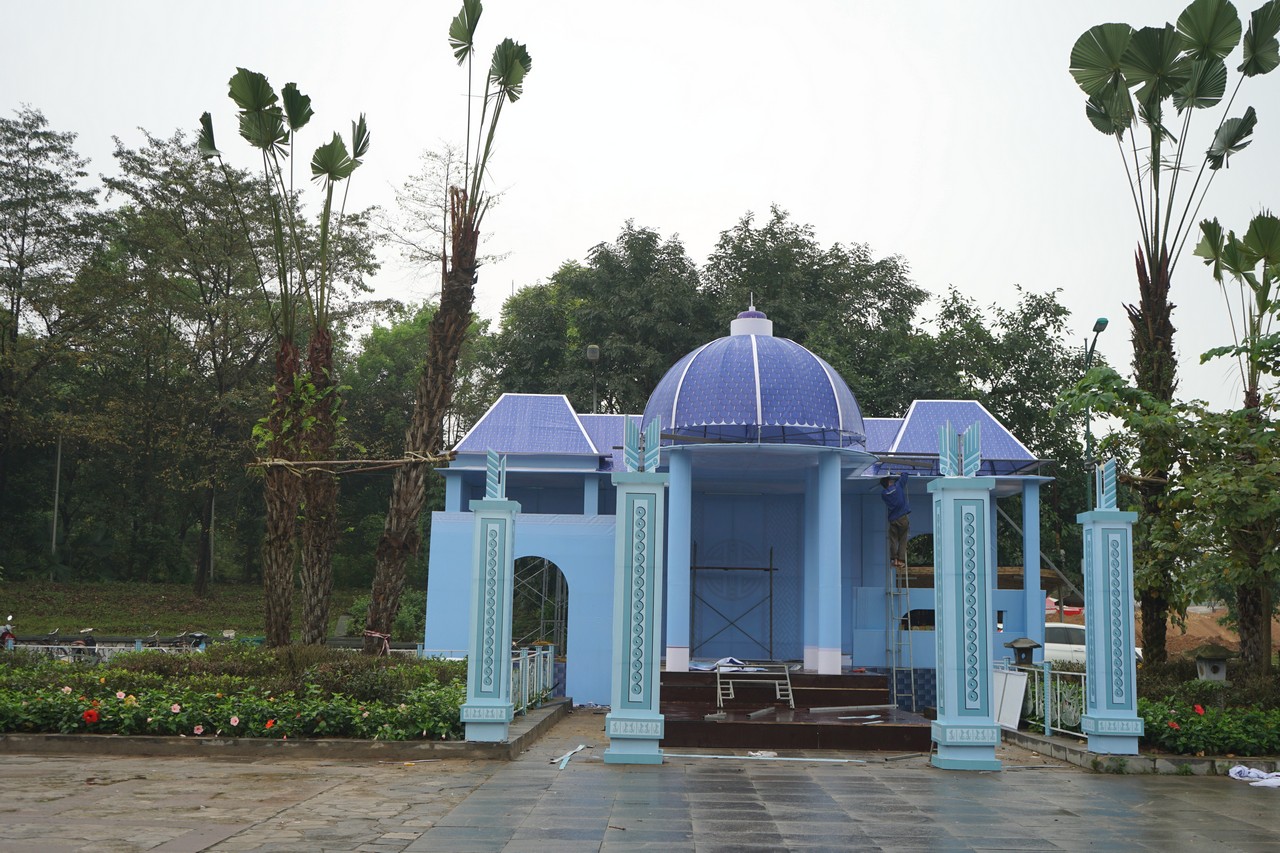 | 광장에서 주요 무대가 개회식에 대비하여 설치되고 있다. |