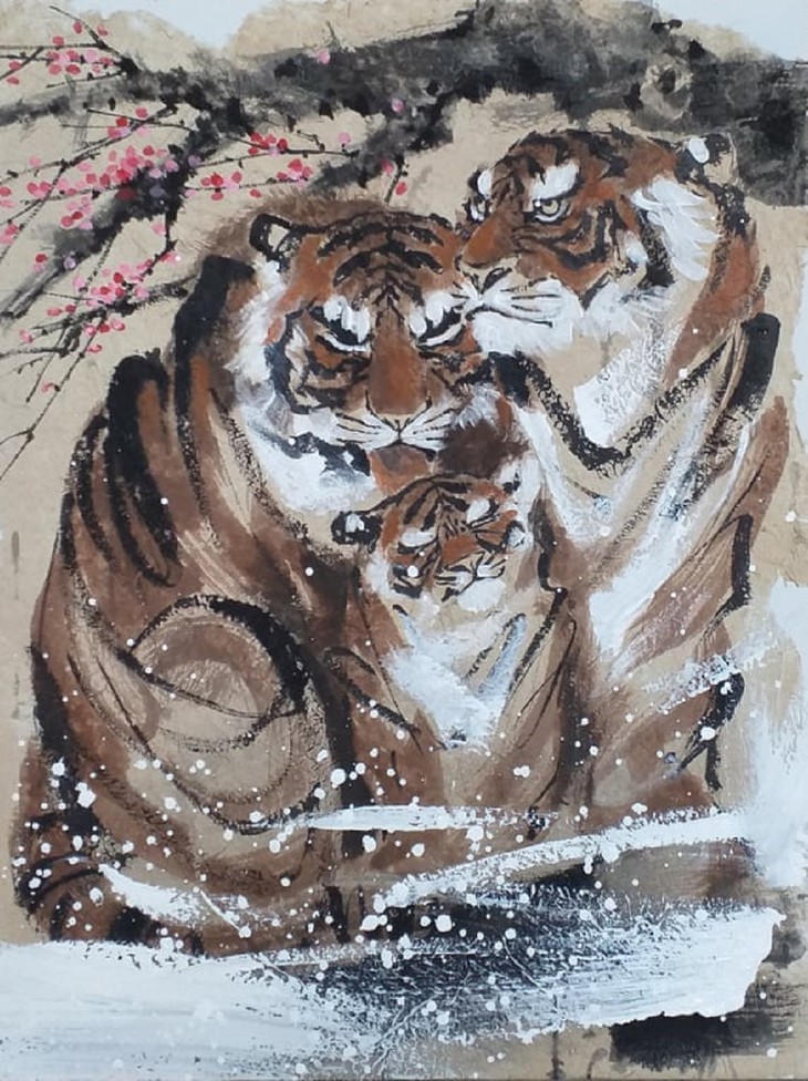 ![]() 그의 호랑이 그림을 통해, 화가 응우옌 단닌은 숲의 신의 늠름한 이미지를 조각하는 것 외에도 모성애와 같은 인간에 가까운 감정적 뉘앙스에 대해 이야기하고 싶어한다.