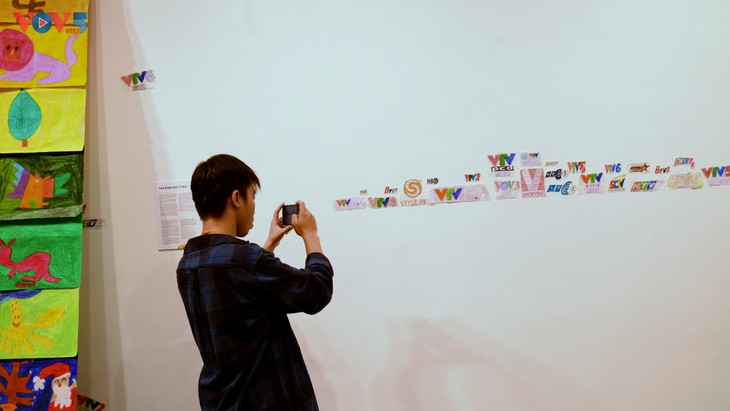 | “흐름”의 옆에는 띤 땅 롱(Đinh Đăng Long)의 작품 “영원한 백만장자”가 있다. 띤 땅 롱(Đinh Đăng Long) 씨는 자신이 알고 있는 국내외 프로그램의 로고와 상징을 리메이크했다. 이 작품은 작가 본인이 친구들과 나누고 싶어하는 보물이기도 하다. |