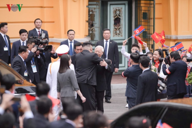 | 3월1일 오후, 수도 하노이의 주석궁에서 응우엔 푸 쫑 서기장 – 국가주석은 김정은 조선노동당 위원장의 환영식을 주재했다. |