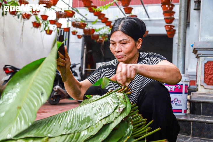 | 한 바인쯩 만들기 시설을 운영 중인 응우옌 티 잡(Nguyễn Thị Dạp) 씨는 설날이 다가오면 집안에 늘 푸른 라종(lá dong, 바인쯩을 삼을 때 쓰는 일종의 큰 나뭇잎)으로 가득 차고 바인쯩을 삶는 냄비들에게서 연기가 늘 자욱하게 난다고 밝혔다. 잡 씨는 “평소에 매일 300~500개를 만드는데 설이 다가오면 매일 1천개~3천개 심지어 1만 개씩을 만들어야 한다”라고 덧붙였다. |