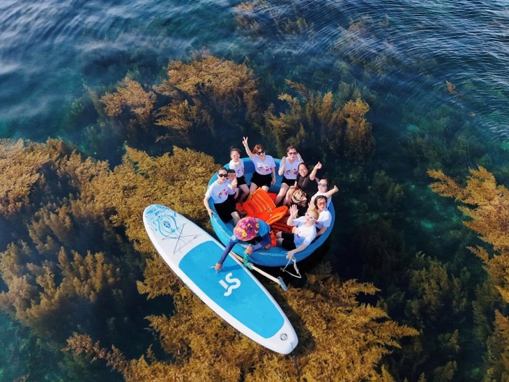 | 모자반 계절에는 많은 해양생물들이 이곳에 와서 번식한다. 이곳 지방정부는 생태계를 보호하기 위해 모자반을 채취하는 일을 금지했다. 이곳에서 어업을 하려면 어민들은 작은 배들을 사용해야 한다. (사진: Hòn Khô Trip) |
