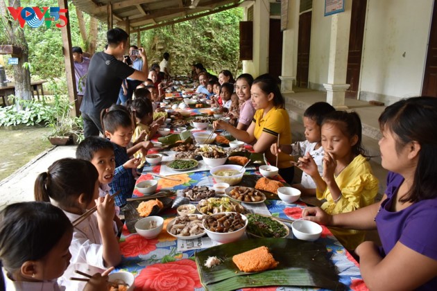 여기에 VOV 청년단이 학생들에게 고기 밥상을 차려 주었다. |