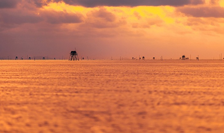 | 끝없이 펼쳐진 해변은 거대한 거울처럼 하늘의 모든 것을 수면에 비추어 반짝이는 아름다운 광경을 연출한다. (사진: Tiến Nguyễn) |