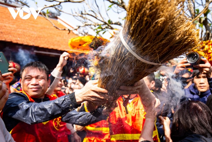 마당 안에서 불 지피기가 시작됐다. 각 팀은 장(giang) 막대기 3개, 마른 대나무 1통과 구겨진 볏짚 등 여러 도구를 사용한다. 불이 타오르는 순간 마당의 분위기도 뜨거워진다.