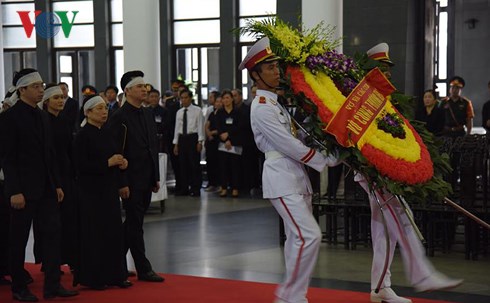 | Tran Dai Quang국가주석 가족 및 친인척들이 관 주위를 돌면서 작별 인사를 하고 있다. 부인과 자식들의 이름이 적힌 화환이 애처롭다. |
