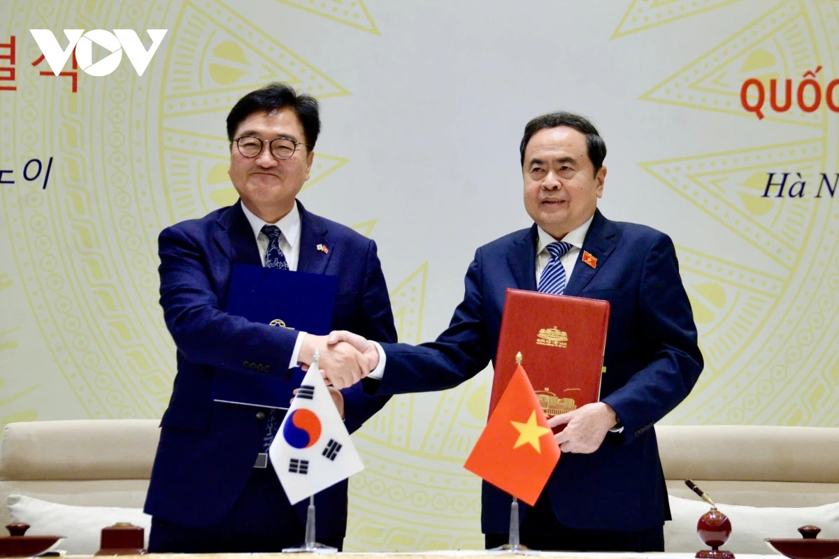 | 회담 직후, 쩐 타인 먼 국회의장과 우원식 국회의장은 베트남 국회와 대한민국 국회 간의 협력에 관한 신규 양해각서(MOU) 서명식을 주재했다. |