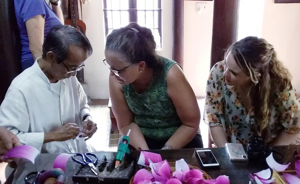 턴반휘 (Thân Văn Huy) 장인은 관광객에게 종이꽃 만드는 법을 안내해 준다. |