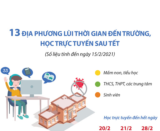 2월 15일 기준, 하노이 (Hà Nội), 하이즈엉 (Hải Dương), 박닌 (Bắc Ninh), 빈투언 (Bình Thuận), 호찌민시 (Hồ Chí Minh), 빈즈엉 (Bình Dương), 하남 (Hà Nam), 빈프억 (Bình Phước), 안장 (An Giang), 벤쩨 (Bến Tre), 타인화 (Thanh Hóa), 껀터 (Cần Thơ), 하이퐁 (Hải Phòng) 등 13개 지방이 2월 28일까지 등교를 연기했으며 온라인 강의를 실시하기로 했다.