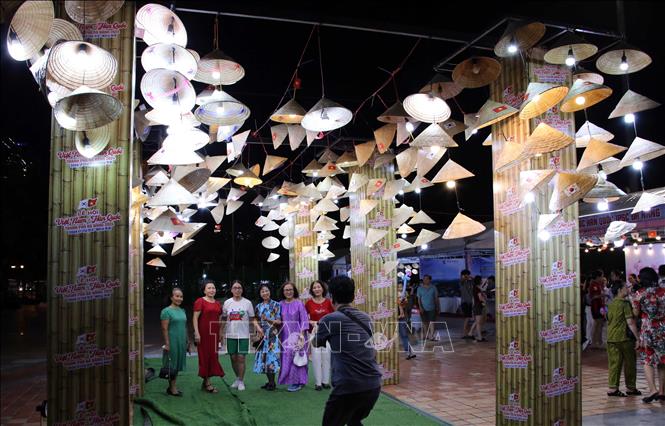 베트남 전통 모자인 논라(Nón lá) 공가에서 기념 사진을 찍는 관광객들 (사진: 베트남 통신사) |