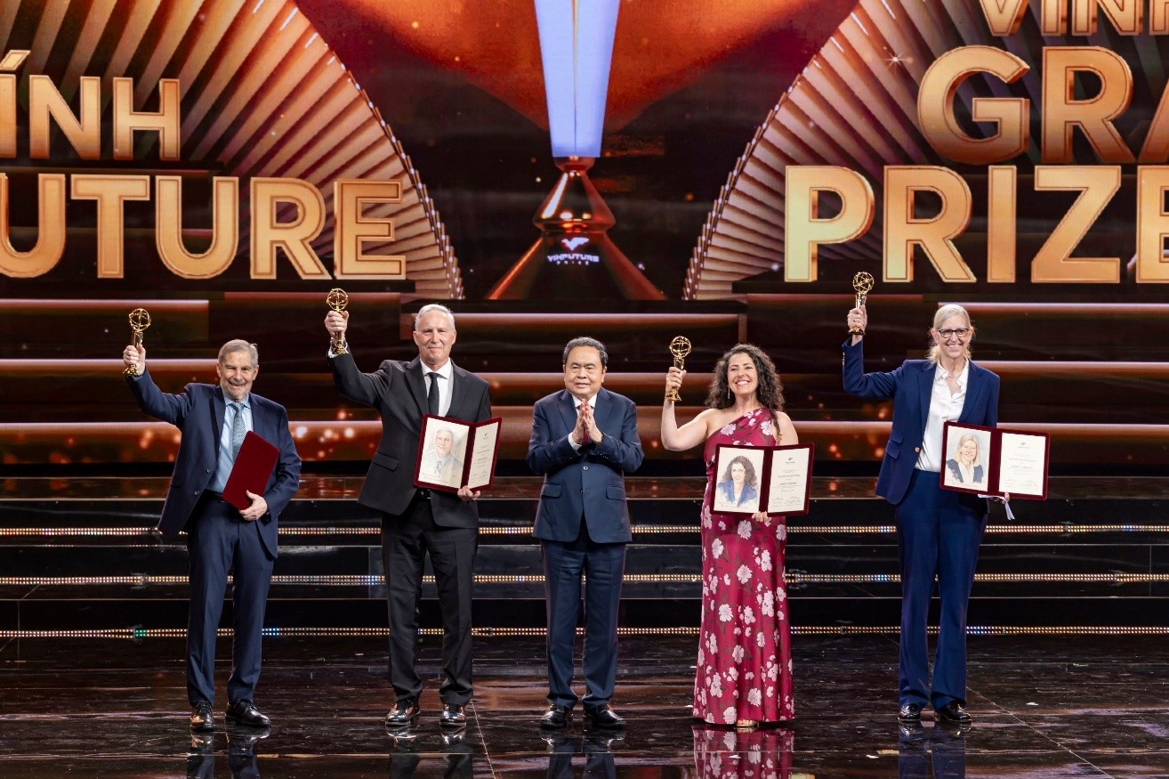 쩐 타인 먼 국회의장이 우수한 과학자들에게 2025년 빈퓨처(VinFuture) 상을 수여하고 있다. (사진: 조직위원회) |
