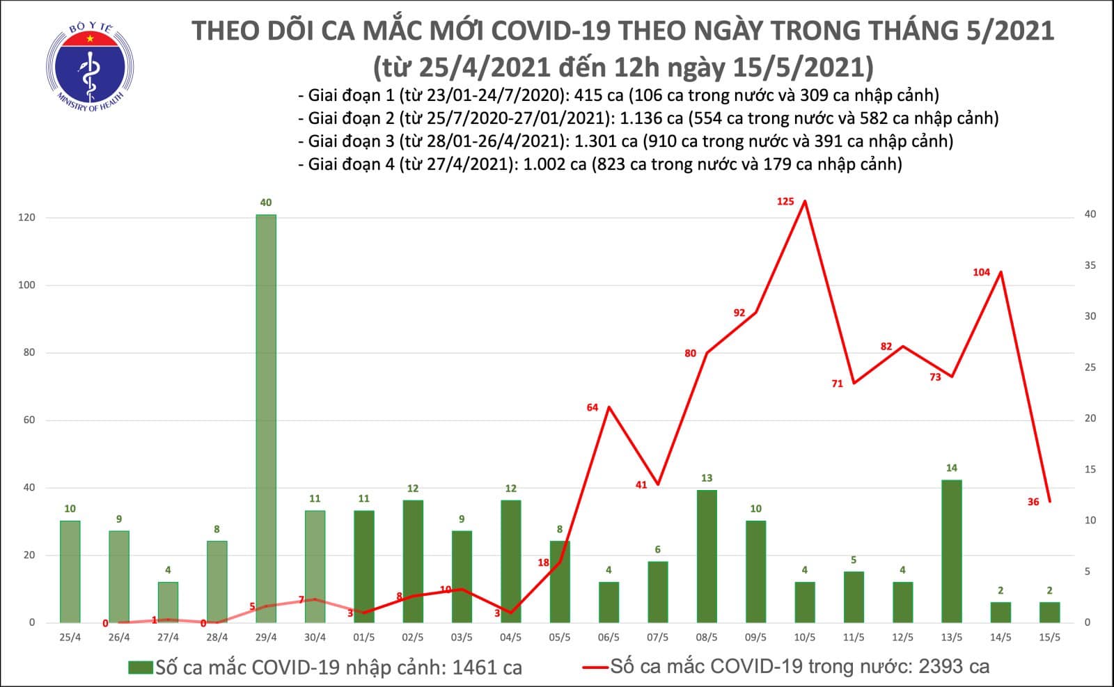 국내 발생 16건은 박장, 디엔비엔, 하노이, 박닌, 하남, 흥옌 등에서 확인되었으며 모두 사전에 격리 중에 있었다. 이에 따라 총 3,854명의 확진자 중 국내 발생이 2,393건, 해외유입이 1,461건으로 기록되었다. 4월 27일부터 현재까지 발생한 확진자 수는 모두 832명이다. 한편, 완치자 수는 2,657명, 사망자 수는 35명이다.