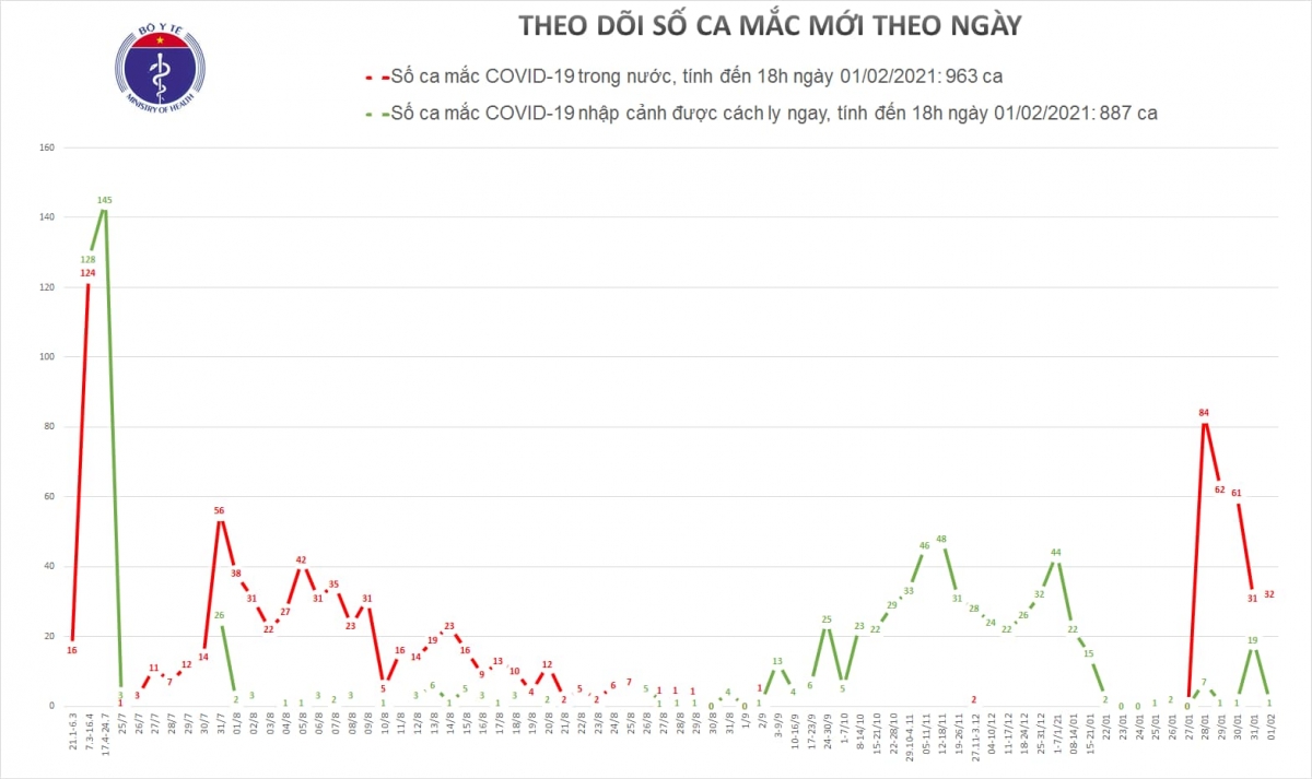 지역사회 코로나19 확진자 30명은 하이즈엉 (Hải Dương) 17명, 꽝닌 (Quảng Ninh) 5명, 하노이 4명, 자라이 (Gia Lai) 2명, 박장 (Bắc Giang) 1명, 빈즈엉 (Bình Dương) 1명을 포함한다. 한 명은 호찌민시로 입국한 직후 바로 격리에 들어갔다. 2월 1일 코로나19 확진자 3명이 완치되었다.
