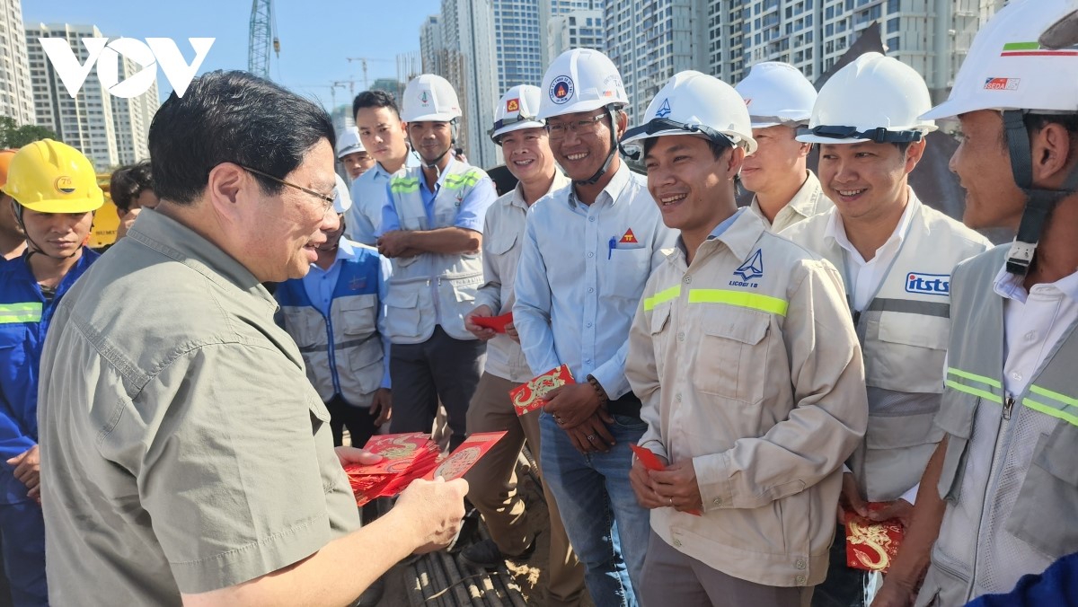 설을 맞아 근로자들에게 리씨를 전한 팜 민 찐 총리 (사진: VOV) |