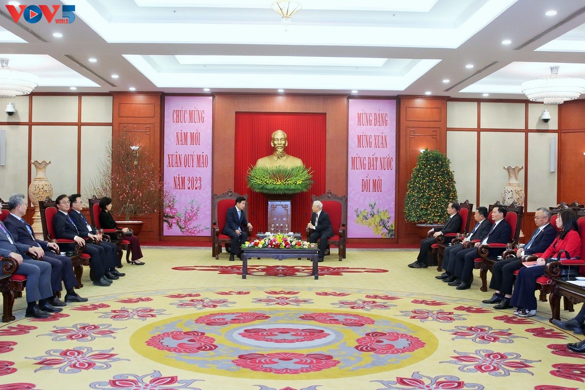 김진표 국회의장과 응우옌 푸 쫑 서기장 (사진: VOV) |