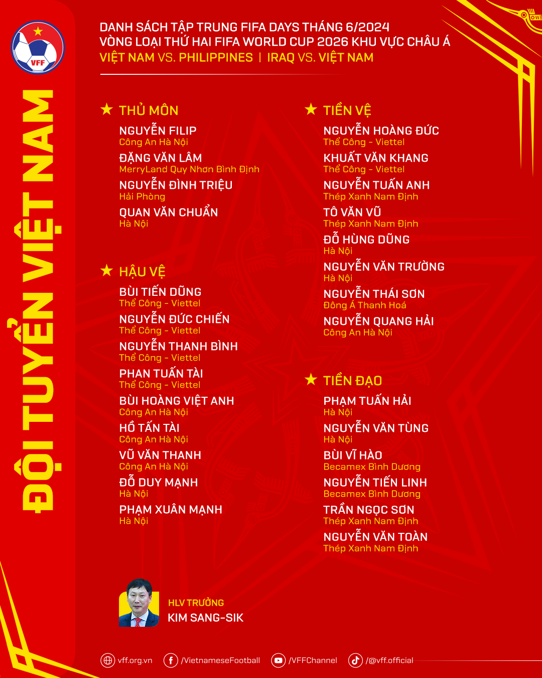 계획에 따르면 베트남 대표팀은 오는 6월 1일부터 집중적으로 연습한다. 김상식 감독과 선수들은 5일 동안 연습하며 오는 6월 6일 저녁 7시에 미딘(Mỹ Đình) 국립 경기장에서 필리핀을 상대로 하는 경기를 치를 예정이다. 이후 대표팀은 이라크로 이동해 6월 11일에 열리는 2026년 월드컵 아시아 2차 예선 마지막 경기인 이라크전에 참가한다.