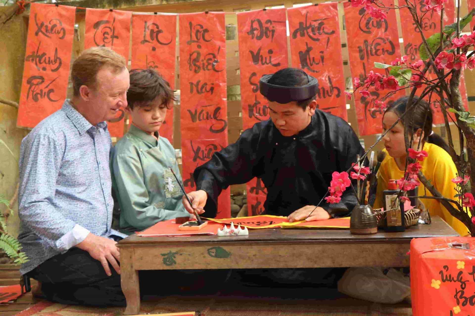 후에에서 서예 쓰기 등 전통 체험 활동에 즐겁게 참여한다. [사진: 꽝안] |