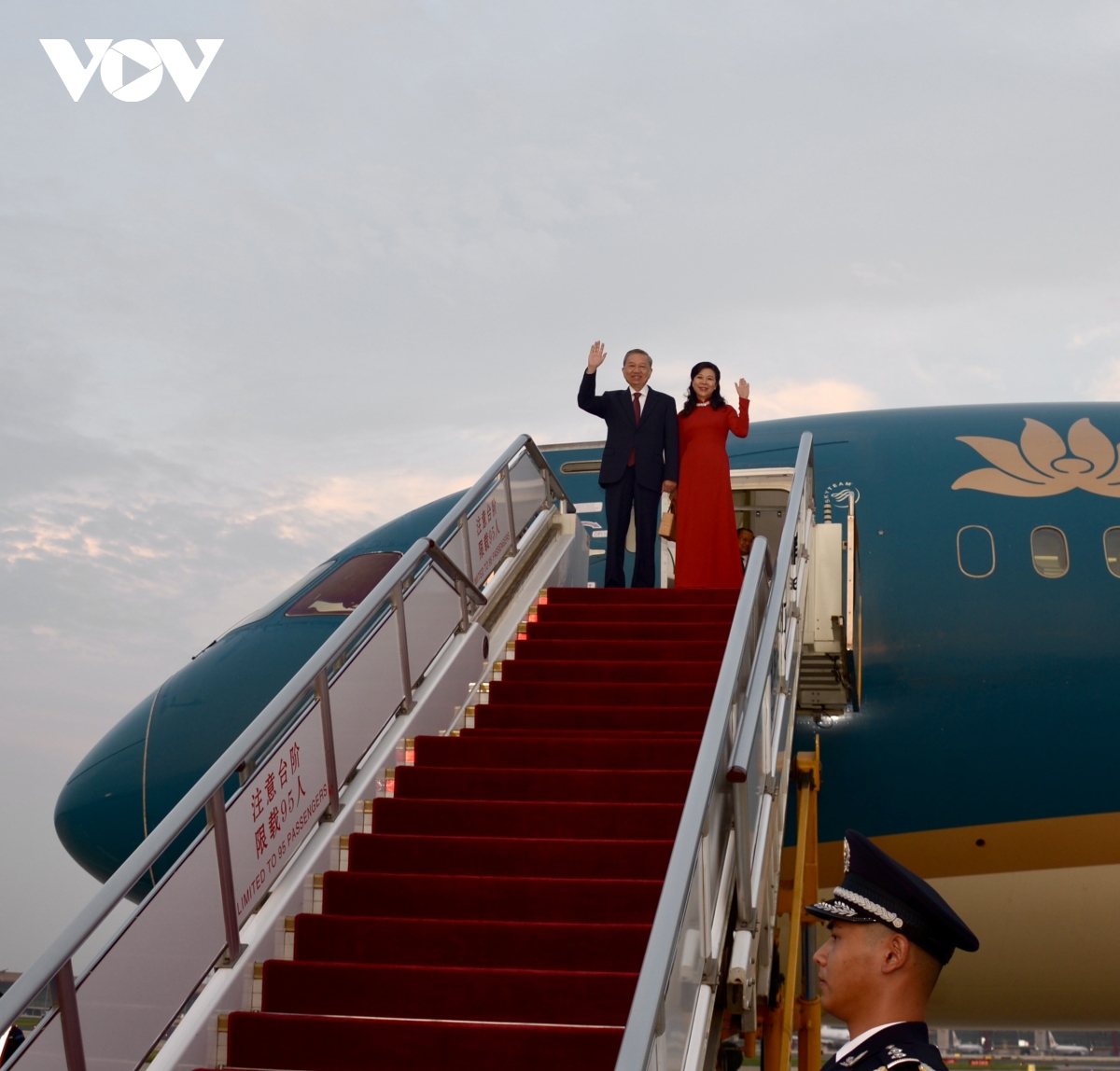 공항에 도착한 또 럼 서기장‧주석과 영부인 (사진: VOV) |